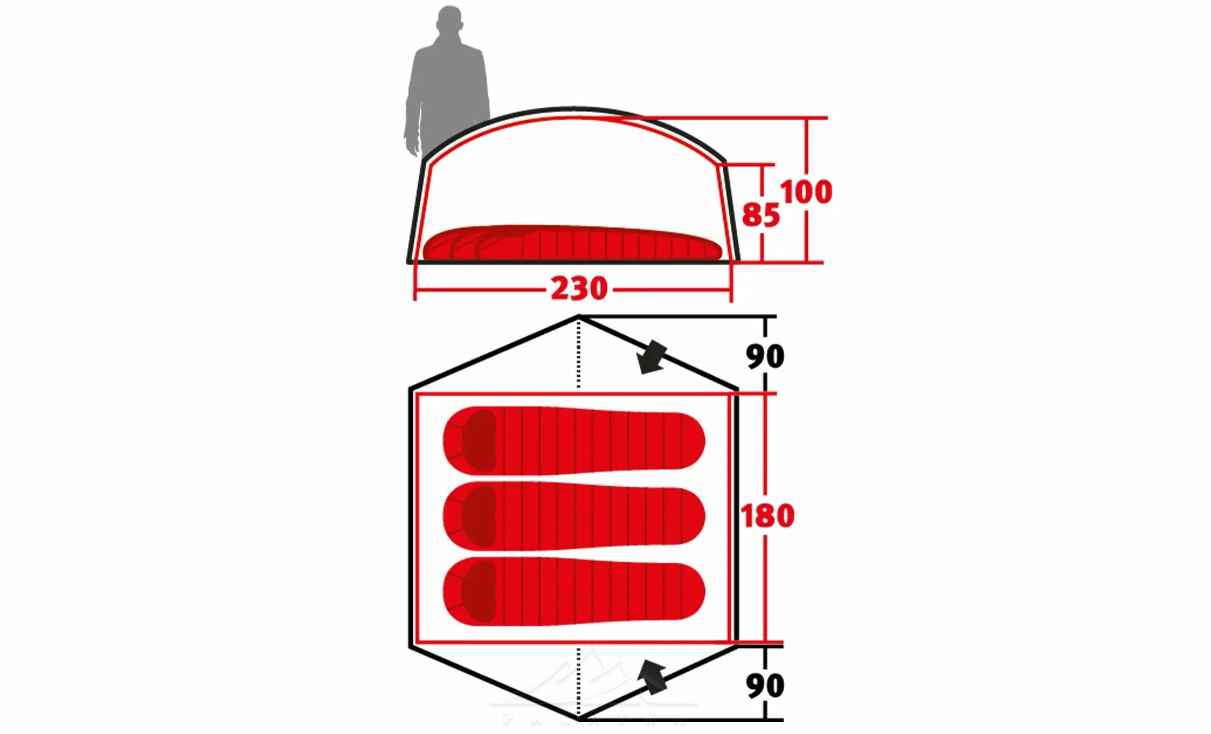 - Два входи + 2 тамбури (глибина ~90 см). Зручно заходити з будь-якого боку, розкласти рюкзаки й взуття окремо, організувати побут у дощ.