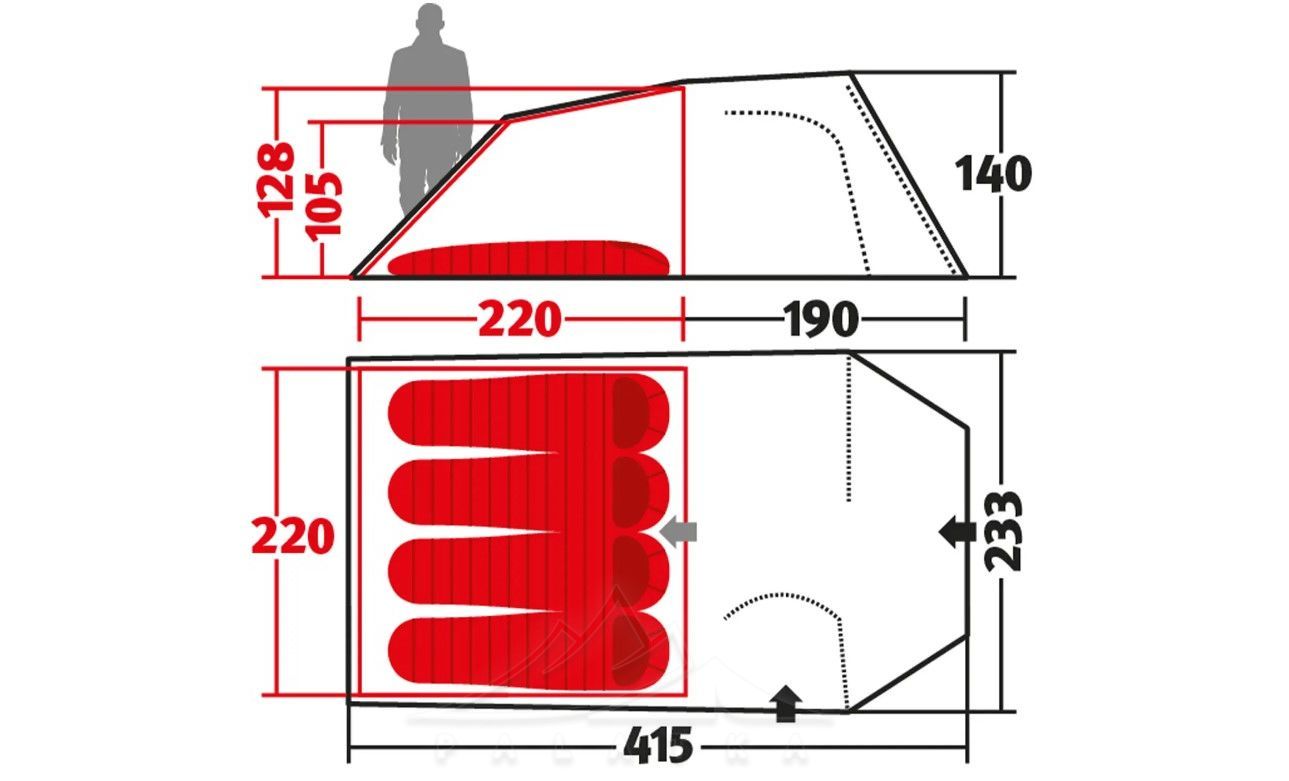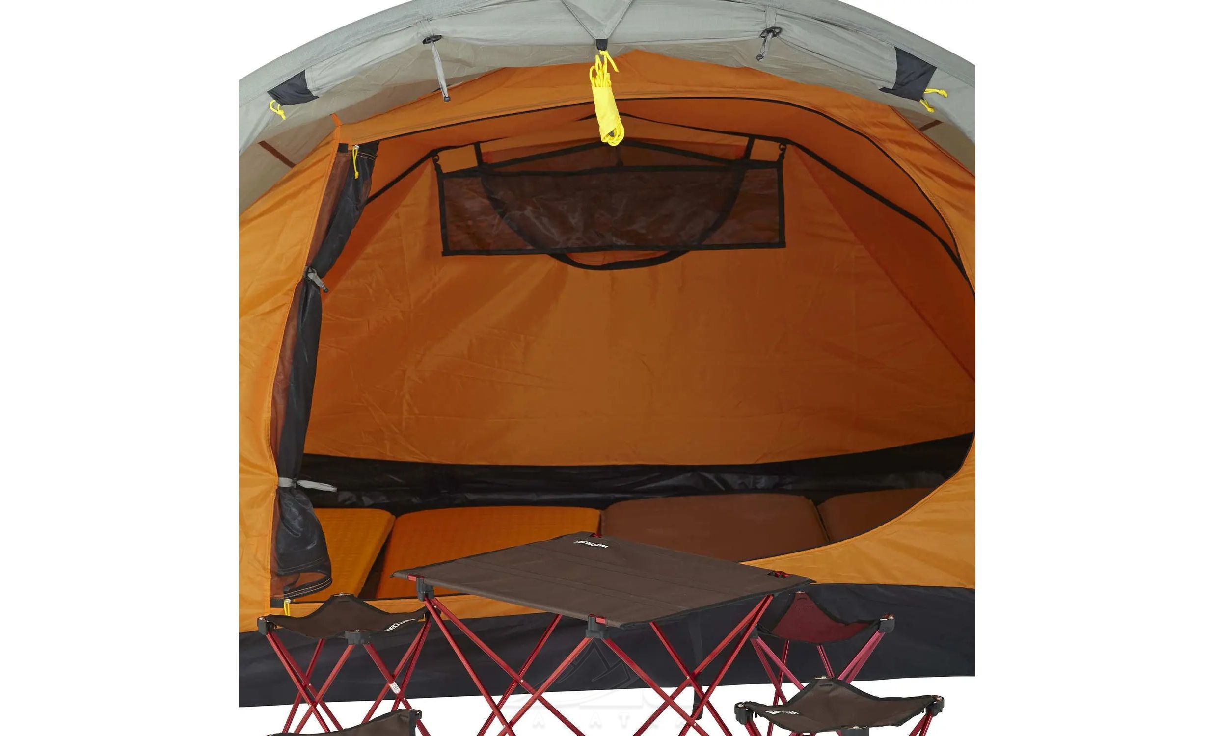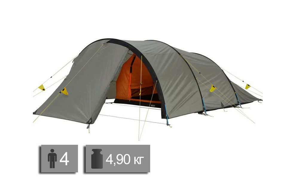 - 4 місця + великий тамбур. Намет розрахований на 4 людей, має один тамбур і великі захищені від дощу входи, тож спорядження можна тримати "під дахом", не забиваючи спальню.