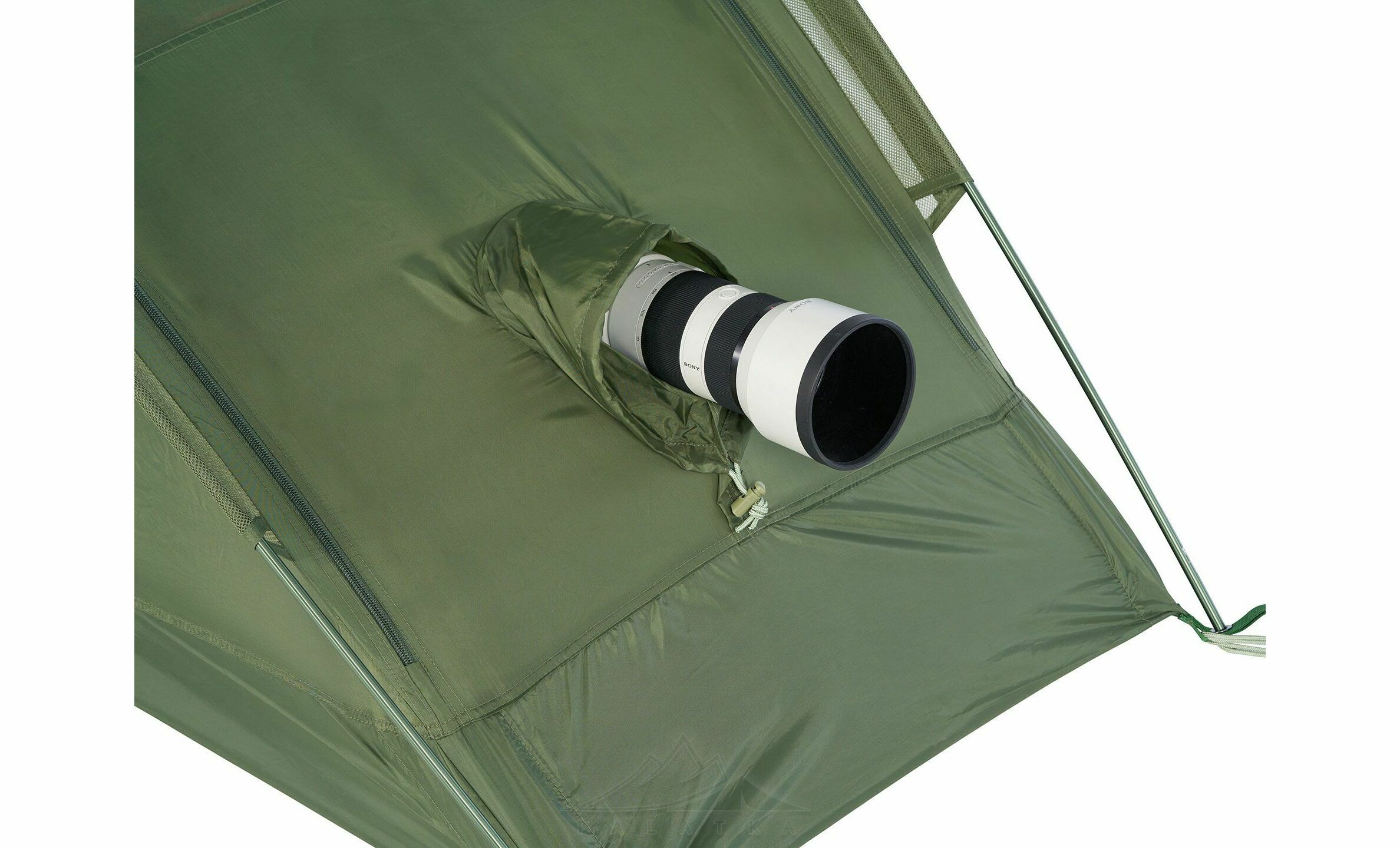 - Особливість для фотографів: окремий вхід та отвір з рукавом для об’єктива розташований "у голові" наметц — зручно для непомітної зйомки дикої природи.