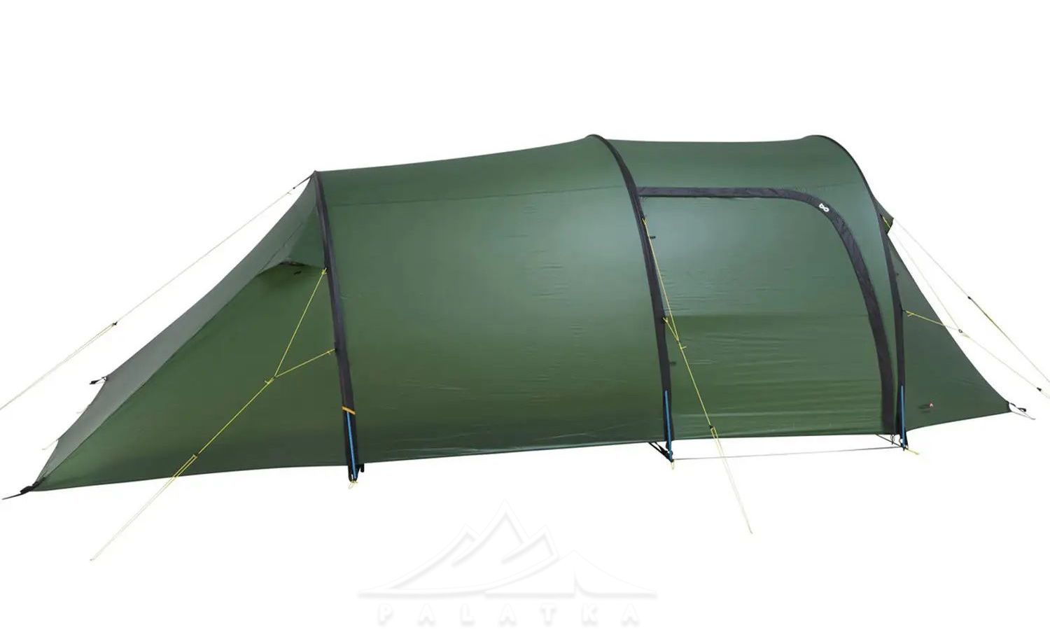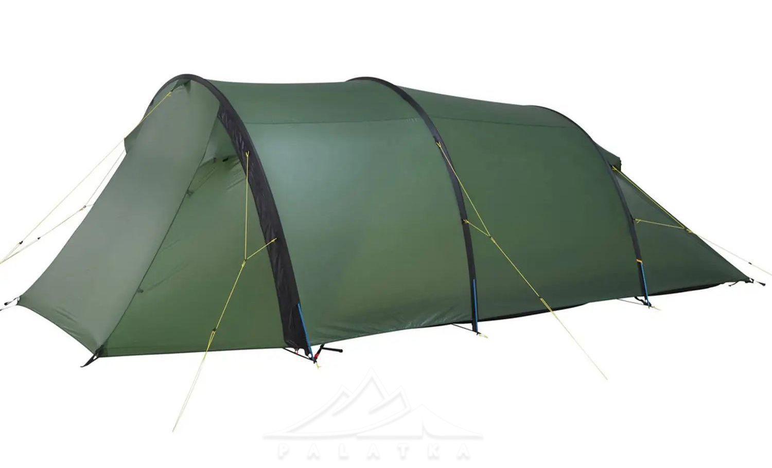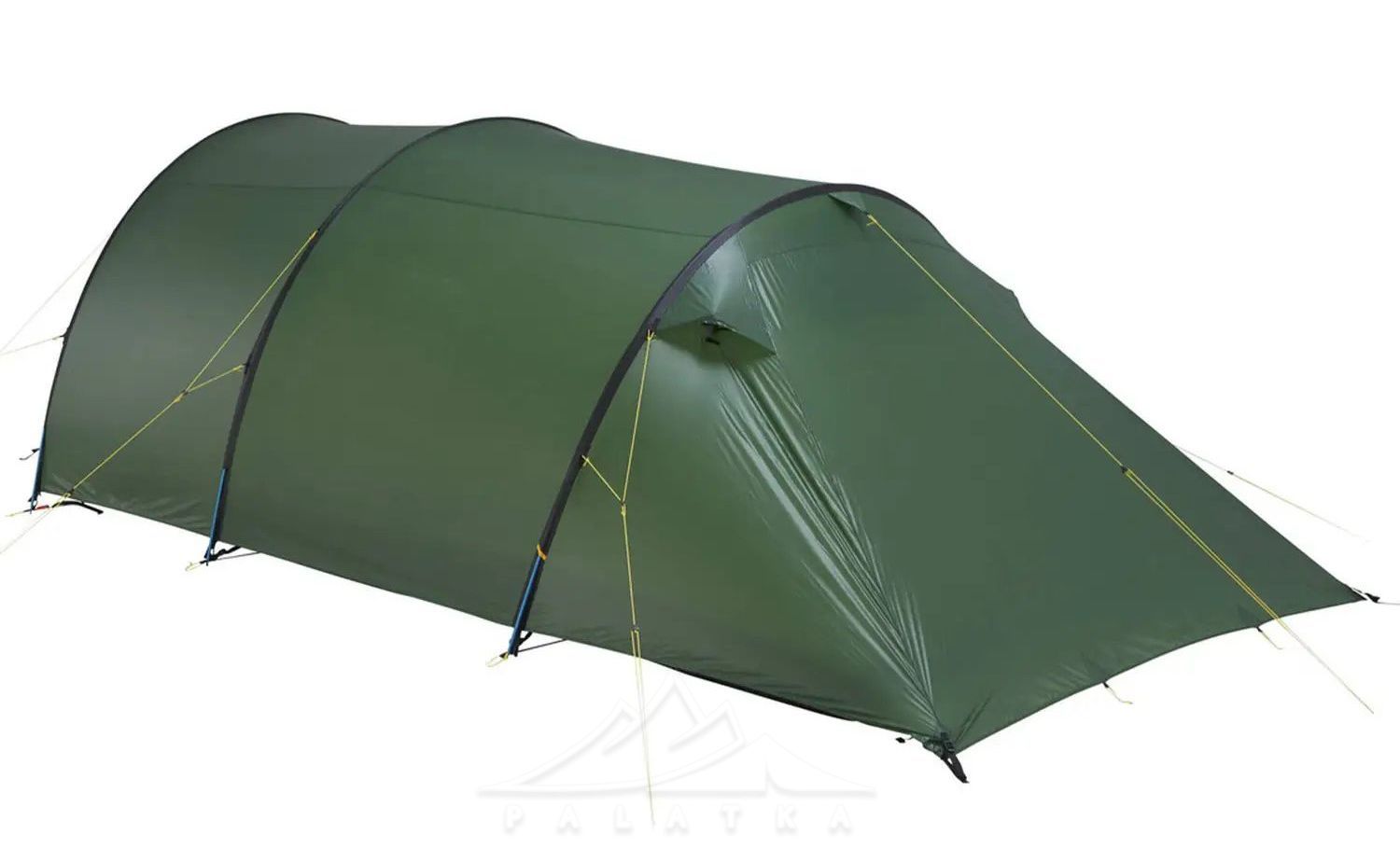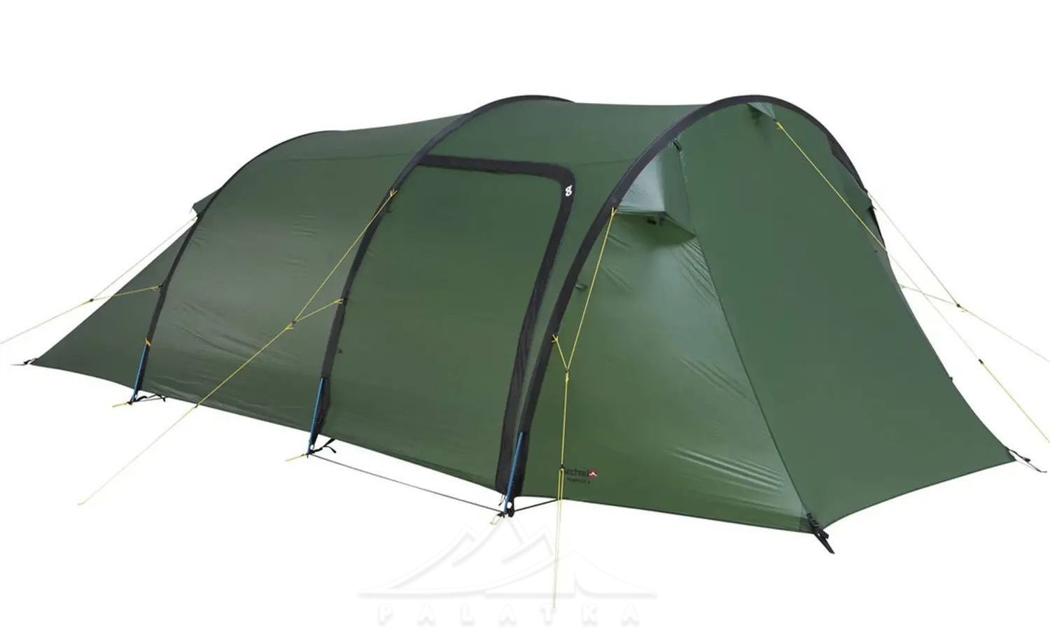 - Конструкція і форма: асиметричний тунельний намет із трьома основними дугами — дає передбачувану форму та стабільність, а тунельна схема добре працює як "універсал" для табору й треку.