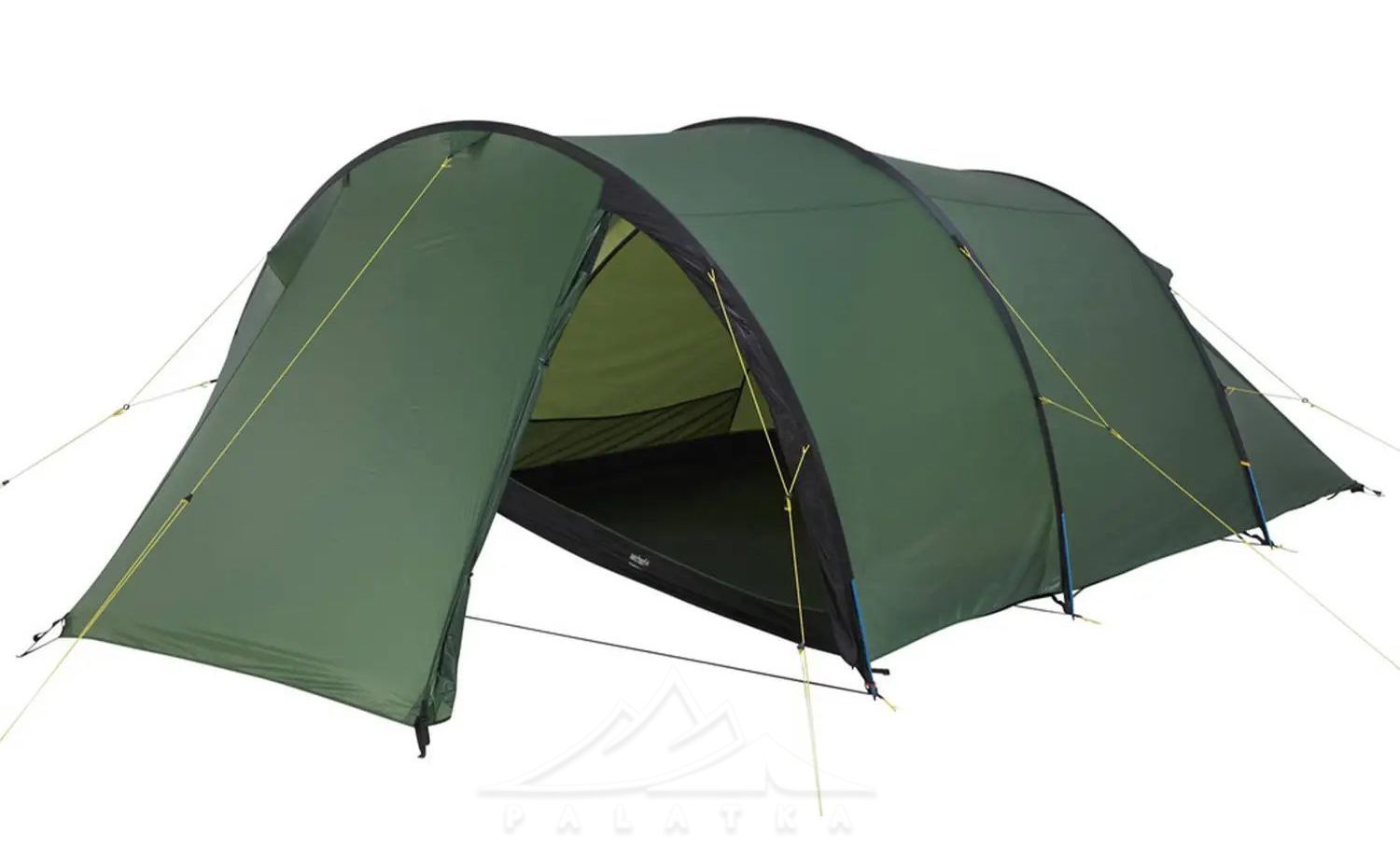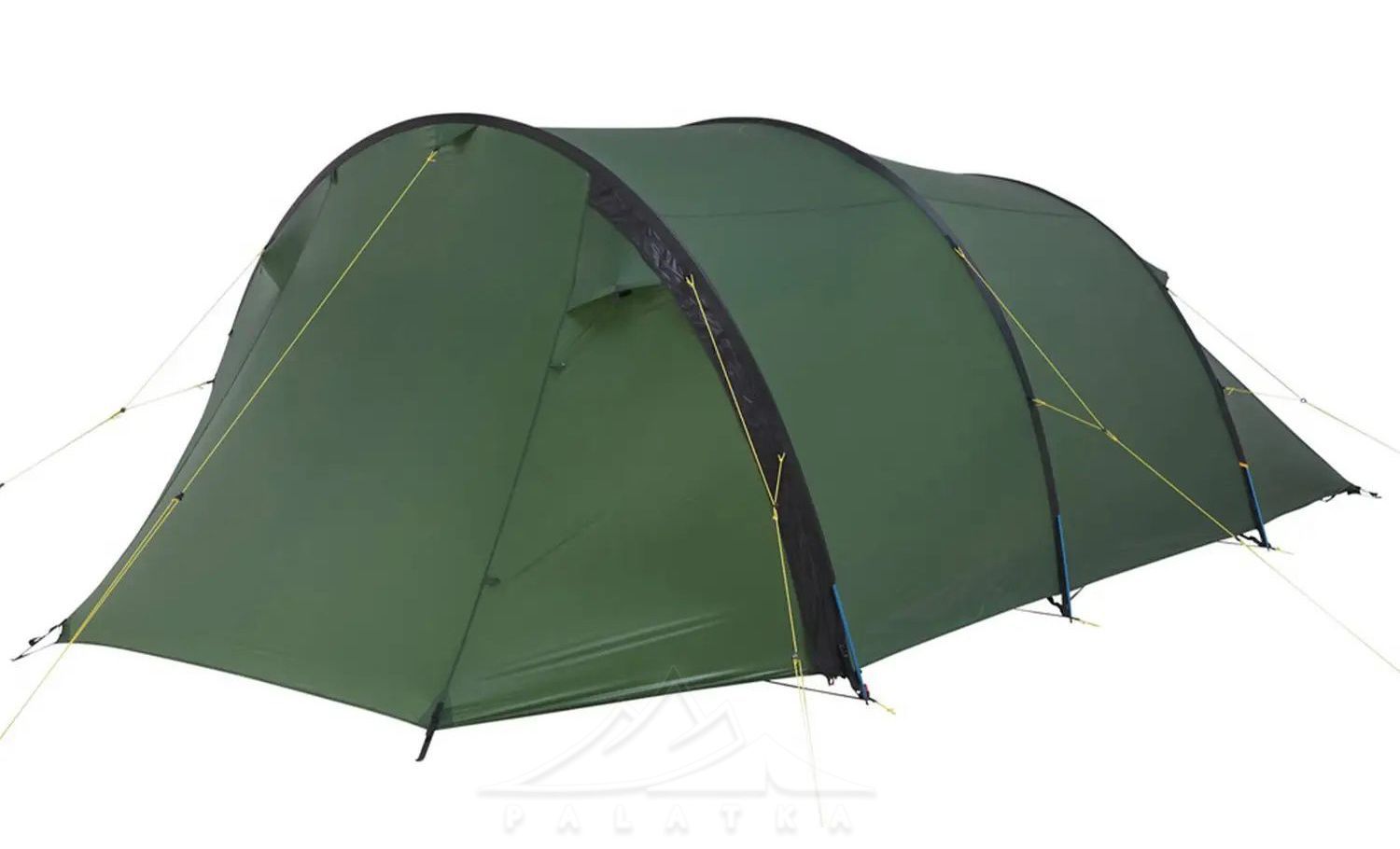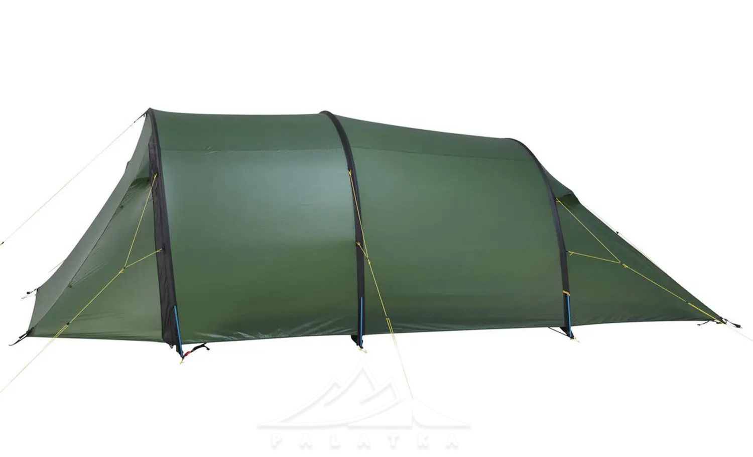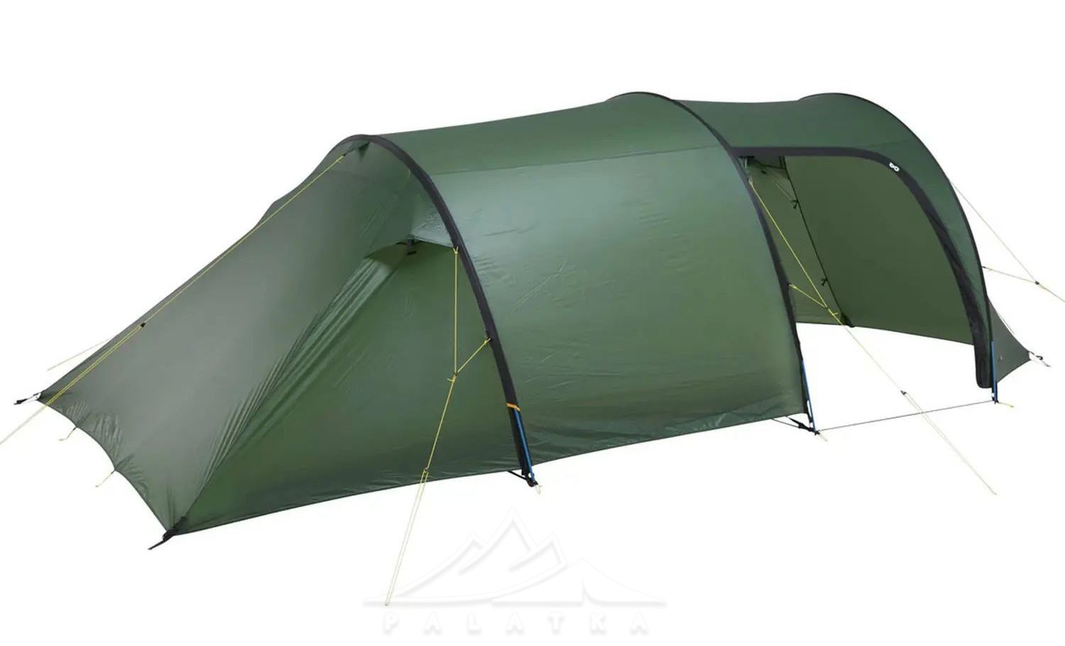 - Конструкція і форма: асиметричний тунельний намет із трьома основними дугами — дає передбачувану форму та стабільність, а тунельна схема добре працює як "універсал" для табору й треку.