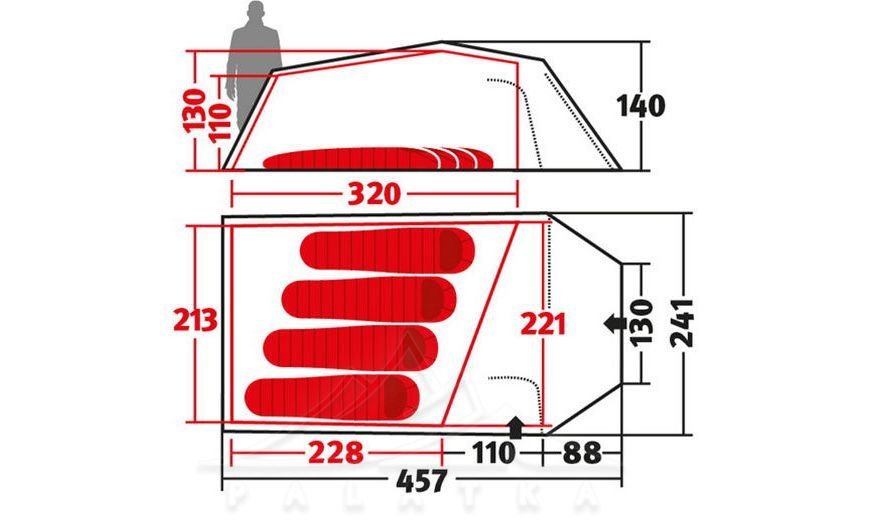 - Великий тамбур з двома входами: зручно розкласти спорядження, готувати/працювати з речами й провітрювати тамбур у спеку (або заходити з різних боків, не заважаючи одне одному).