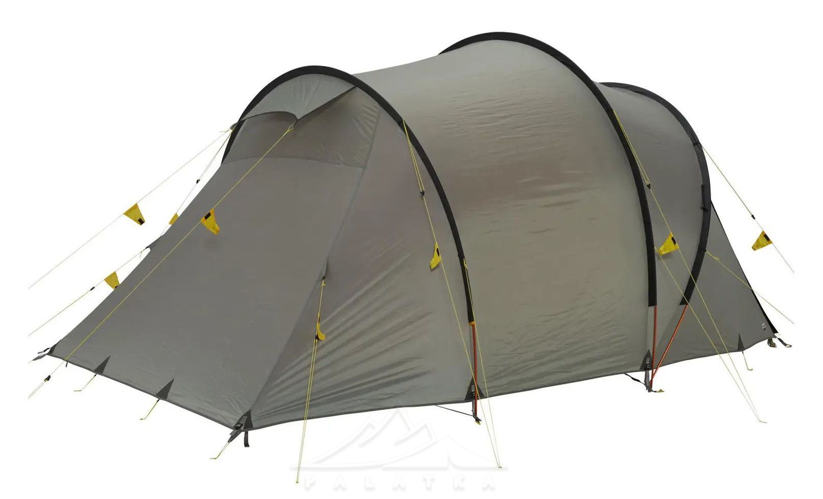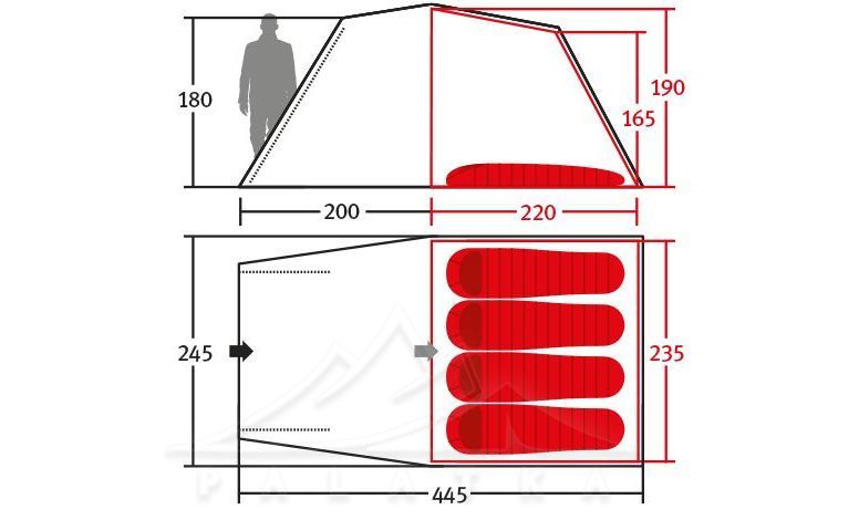 - Конструкція: тунель + зовнішній тип каркасу. Спочатку ставиться тент, тож внутрішня спальня менше намокає під час встановлення в дощ; плюс за потреби намет можна використовувати без спальні — як просторе укриття для табору.