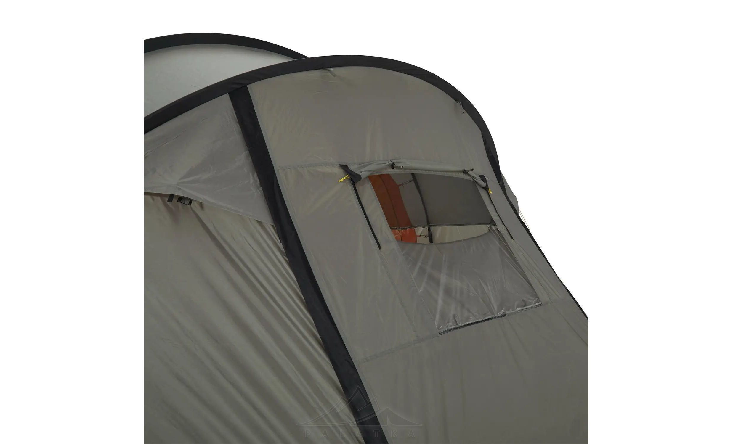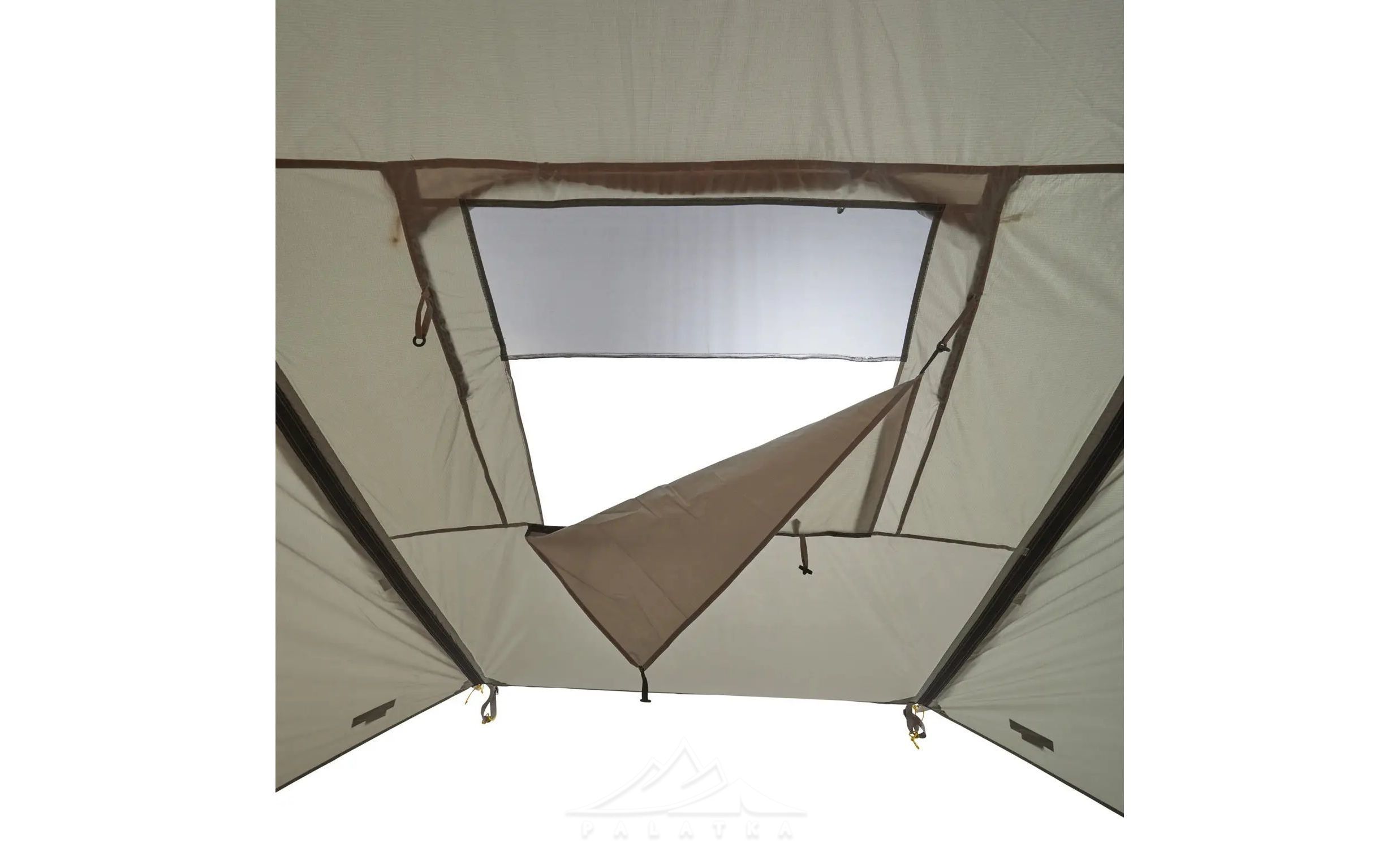 - Центральний вхід із віконцем: вікно поєднує зону з москіткою (для вентиляції без комах) і прозору зону (для огляду/світла). Обидві частини закриваються шторками, тож можна повністю "заглушити" світло й протяги, коли потрібно.