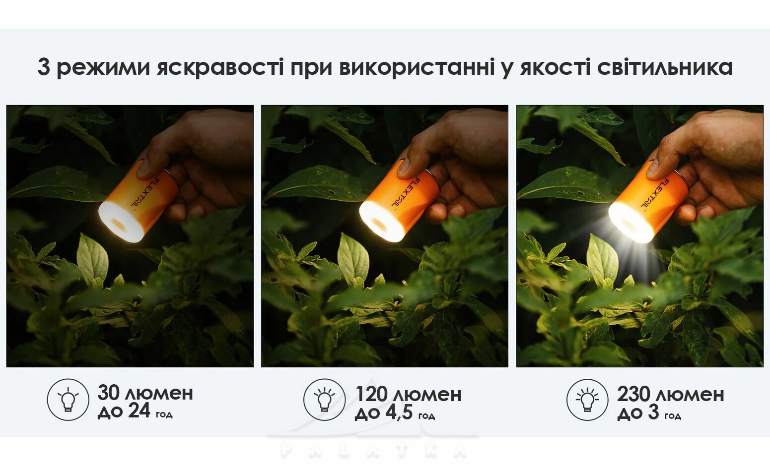 - 3 режими роботи світильника: 30 лм (до 24 год), 120 лм (до 4,5 год) та 230 лм (до 3 год).