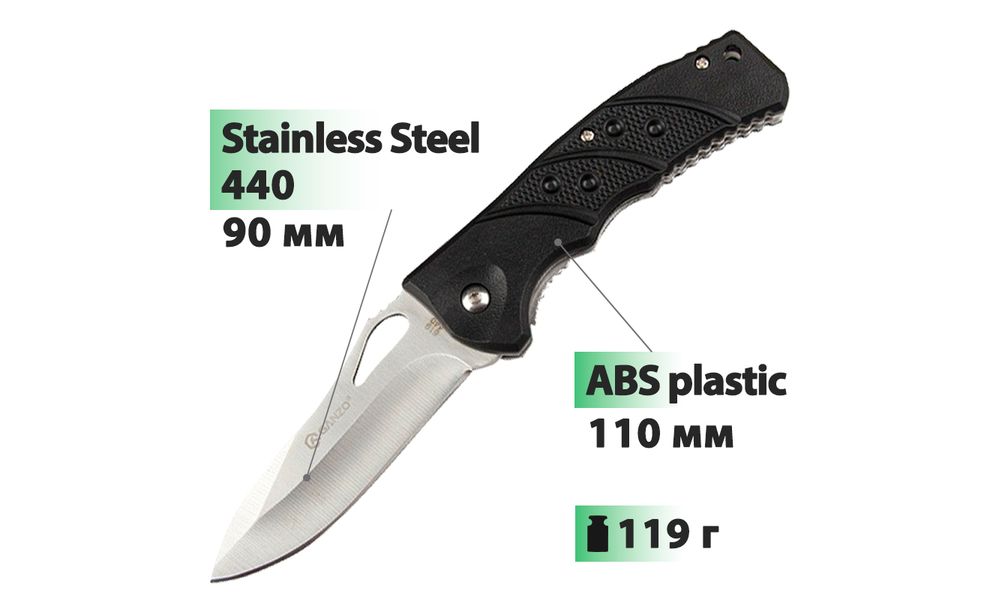 - Лезо має отвір, який спрощує конструкцію ножа, а ребриста поверхня дає змогу зручно працювати з твердими матеріалами.