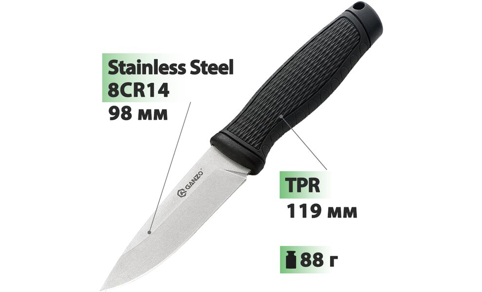 Ganzo G806-BK — це практичний ніж із фіксованим лезом форми Drop Point, що відзначається універсальністю та зручністю у використанні. Ідеально підходить для активного відпочинку — туризму, полювання, риболовлі або кемпінгу.