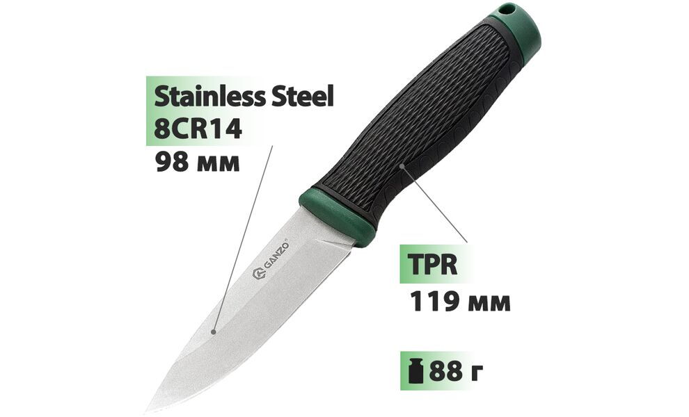 Ganzo G806-BK — це практичний ніж із фіксованим лезом форми Drop Point, що відзначається універсальністю та зручністю у використанні. Ідеально підходить для активного відпочинку — туризму, полювання, риболовлі або кемпінгу.