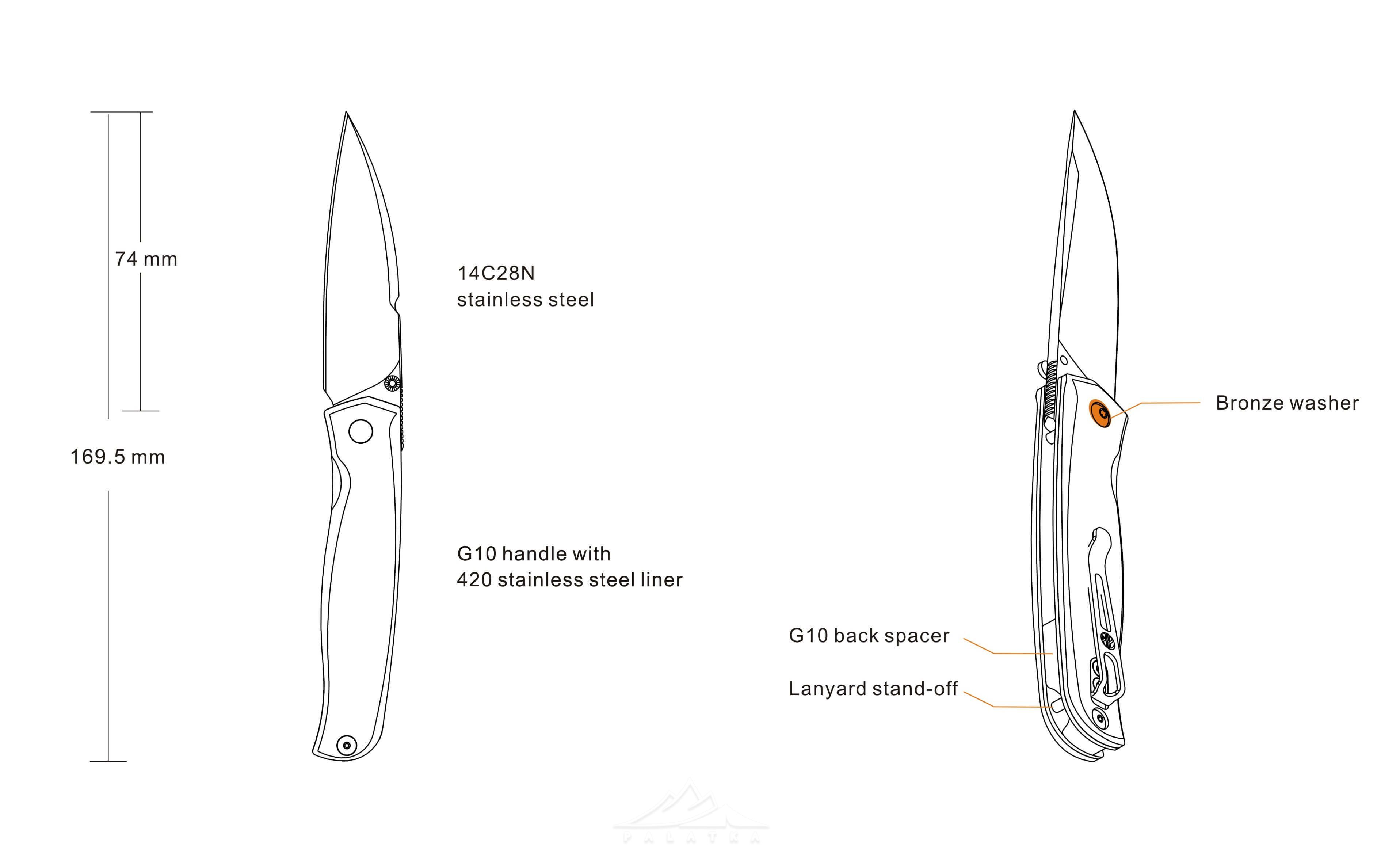 - Форма леза — Wharncliffe, добре підходить для різання та шкребіння, не зручно використовувати для наколювання.