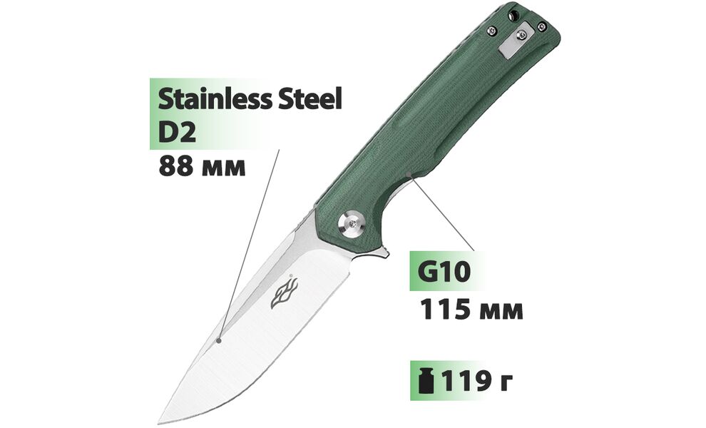 • Руків'я зі склопластику G10 — міцний, легкий, стійкий до вологи, температури та механічних пошкоджень матеріал.