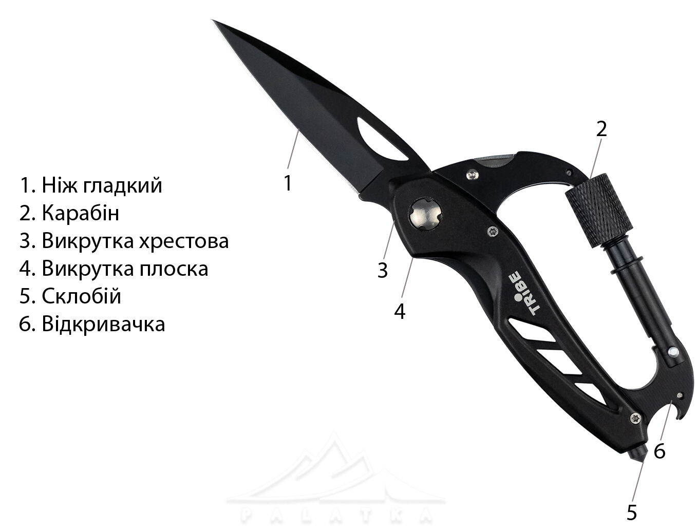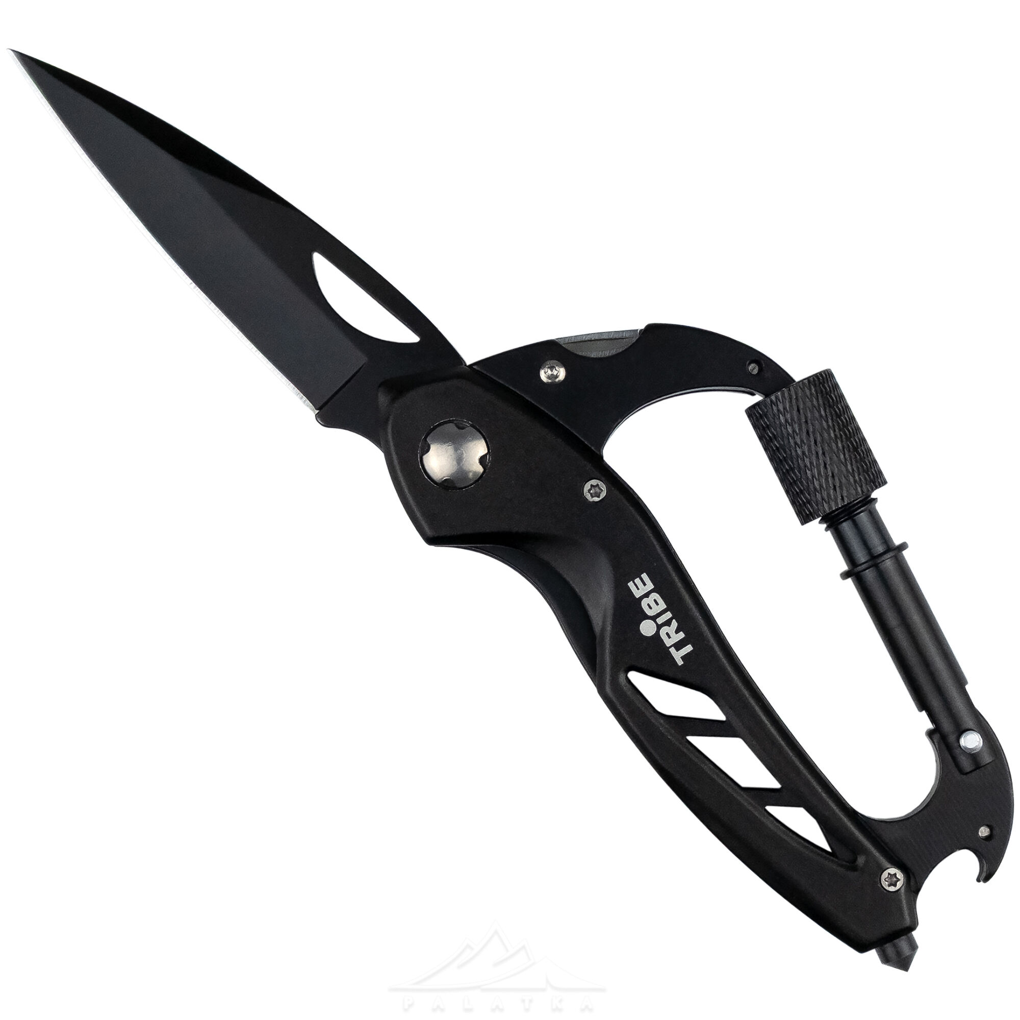 Tribe Carabiner Knife — це багатофункціональний інструмент, який поєднує в собі складний ніж та карабін з муфтою. Він стане в нагоді у походах, подорожах, під час риболовлі чи в повсякденному використанні.