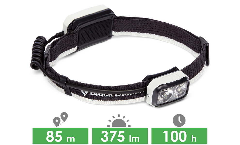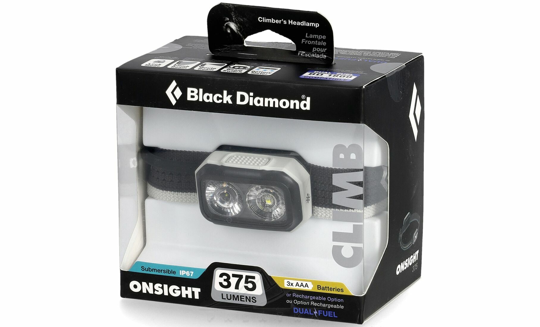 Налобний ліхтар Black Diamond OnSight 375 — це знахідка для кожного альпініста. Він ідеально підійде для сходження на вершини і допоможе орієнтуватися у просторі навіть після заходу сонця. Ліхтар має гібридний тип живлення. Він здатен працювати як від батарейок (в комплекті), так і від акумулятора (купується окремо). Світло цього ліхтаря має 3 рівні яскравості, які плавно регулюються, режими строб та SOS, а також розсіяне світло та сфокусований промінь.
