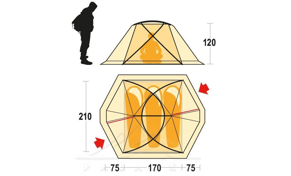 - Сніго- та вітрозахисна спідниця на зовнішньому тенті для регуляції мікроклімату всередині намету.