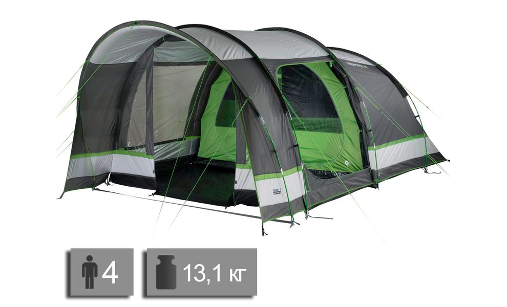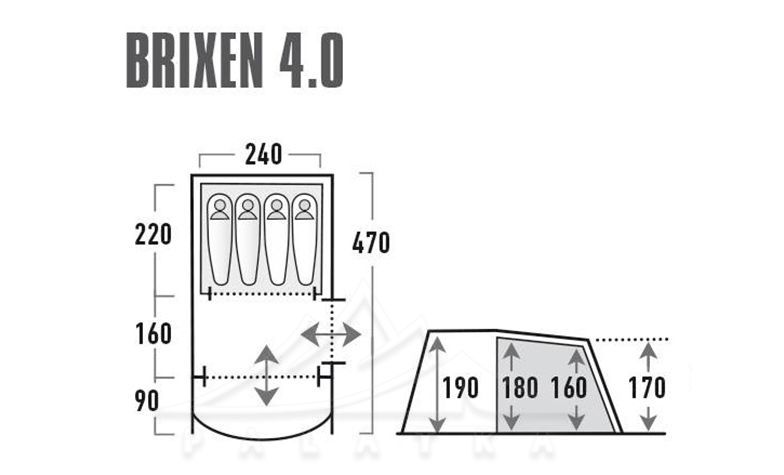 Намет High Peak Brixen 4.0 — 4-місний кемпінговий намет для комфортного відпочинку на природі. Має великий високий тамбур з зовнішнім козирком та 1 спальню. Алюмінізоване покриття зовнішнього тенту.