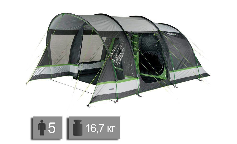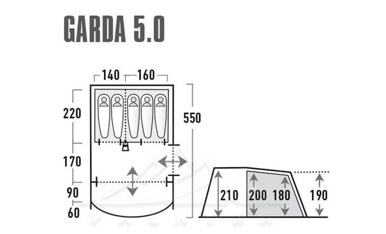 Намет High Peak Garda 5.0 — 5-місний кемпінговий намет для комфортного відпочинку на природі. Має великий високий тамбур з зовнішнім козирком та 1 спальню (можна розділити на 2). Алюмінізоване покриття зовнішнього тенту.