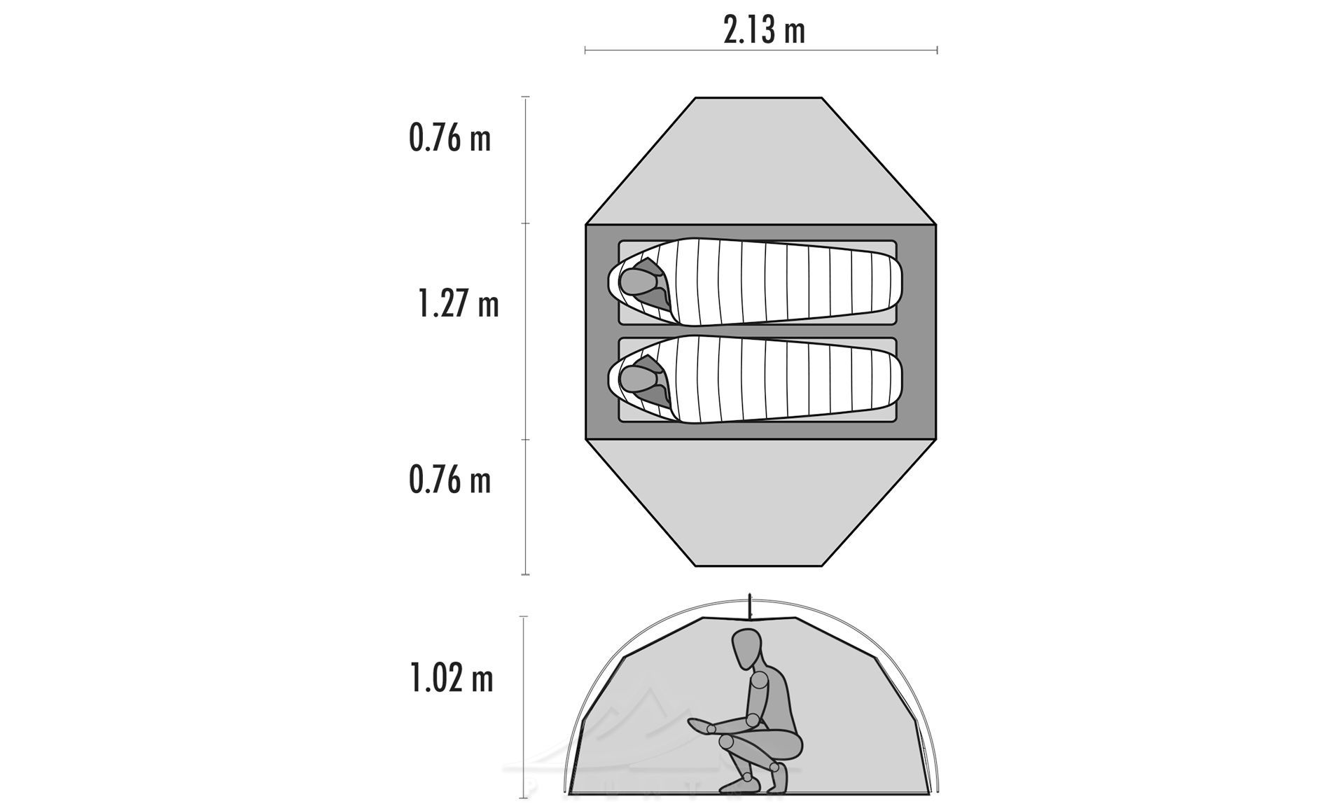 - Стінки внутрішнього намету виконані з комбінації посиленого нейлону (40D Nylon RipStop DWR) та мілкої сітки (20D Nylon Micromesh) для полегшеня ваги, захисту від комах та гарної вентиляції.