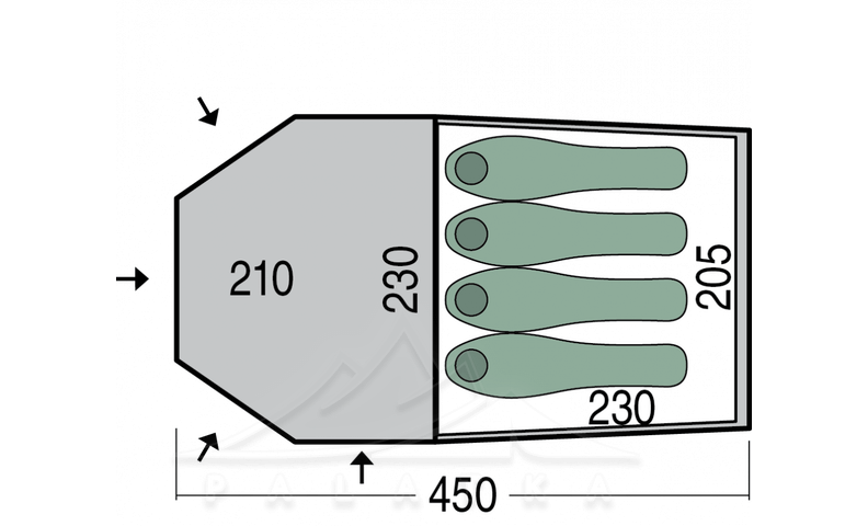 - 1 дуже місткий тамбур для розміщення спорядження та взуття, а також приготування їжі за негоди.