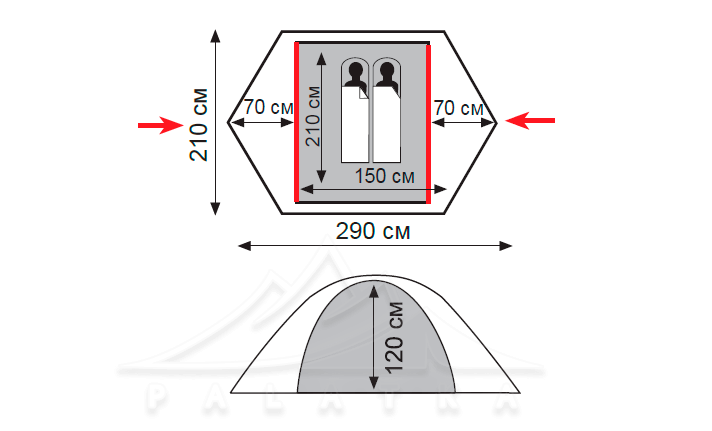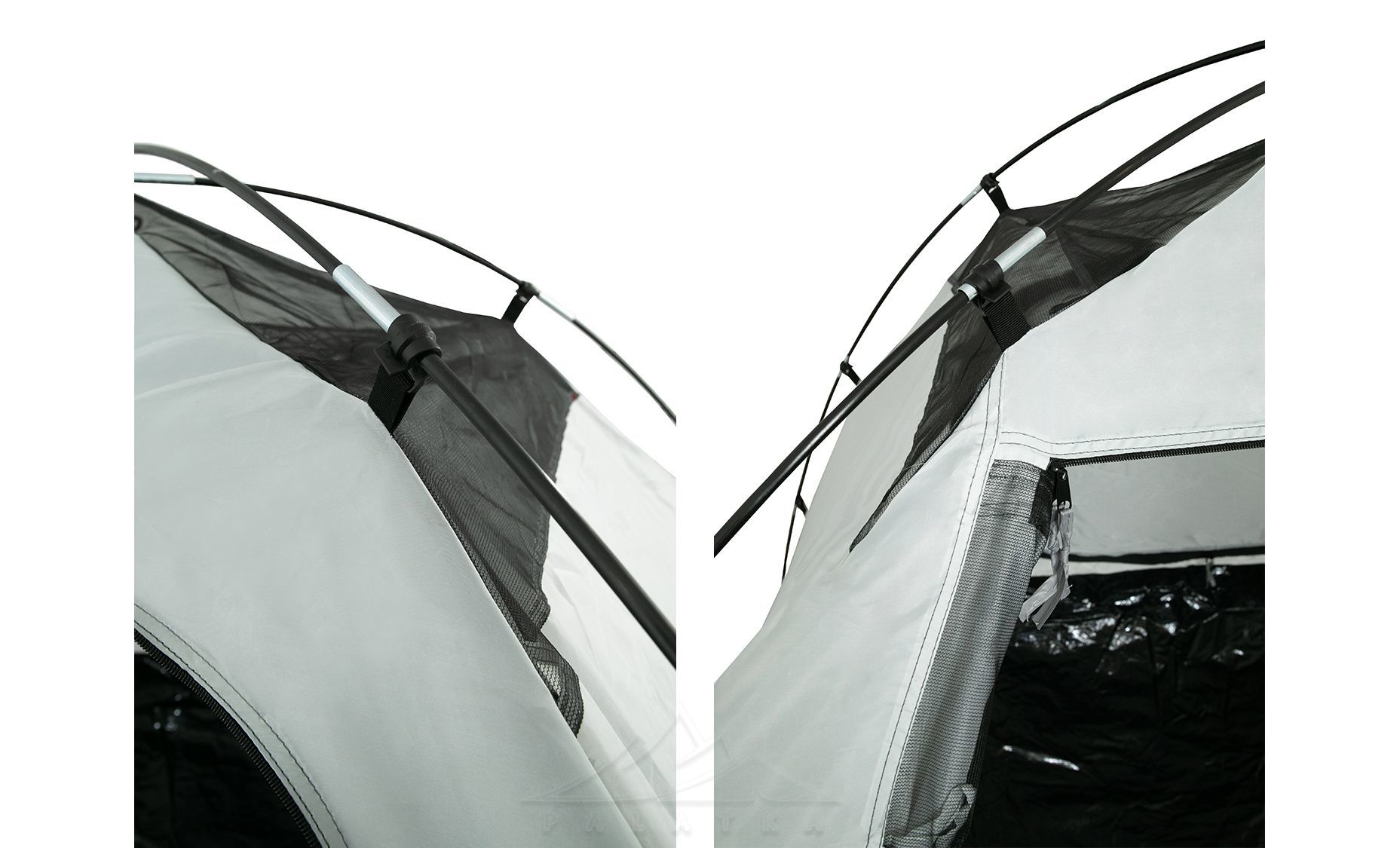 - 2 вентиляційні віконця у зовнішньому тенті зі складними стійками-підпорами
