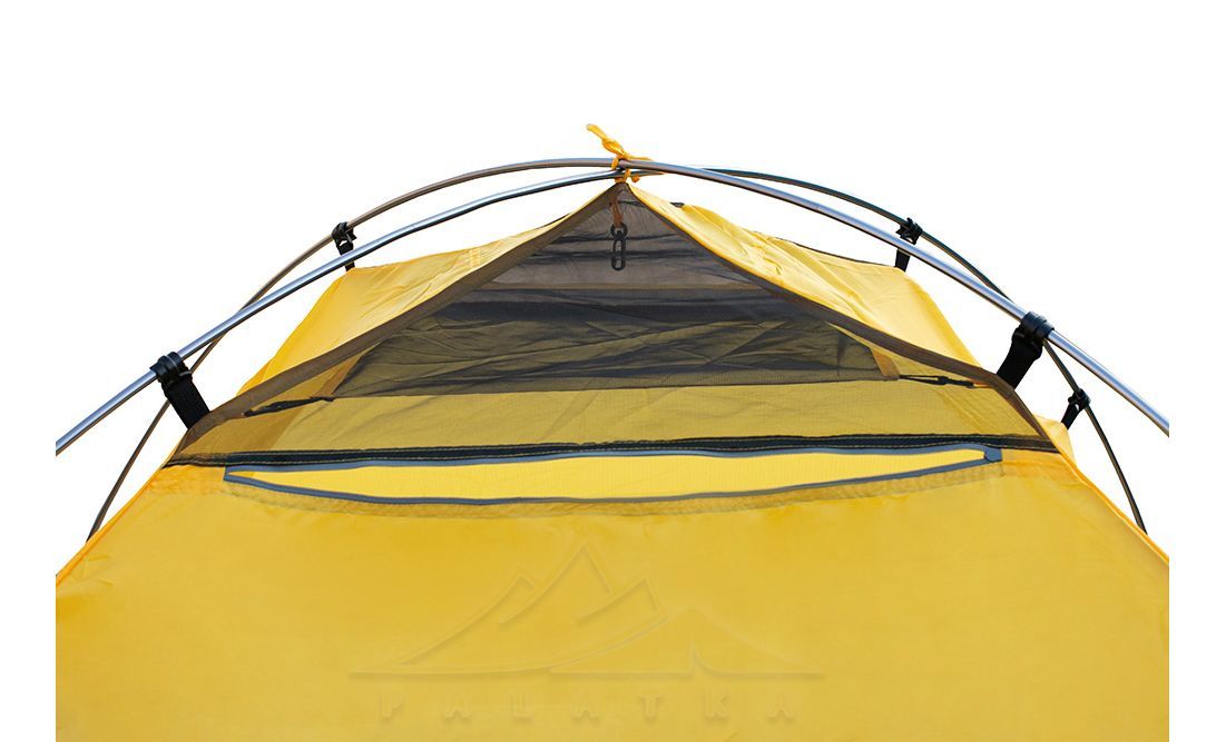 - Сітчасті вентиляційні вставки вгорі на внутрішньому наметі, з блискавками, що дозволяє регулювати вентиляційні віконця зовнішнього намету не виходячи назовні