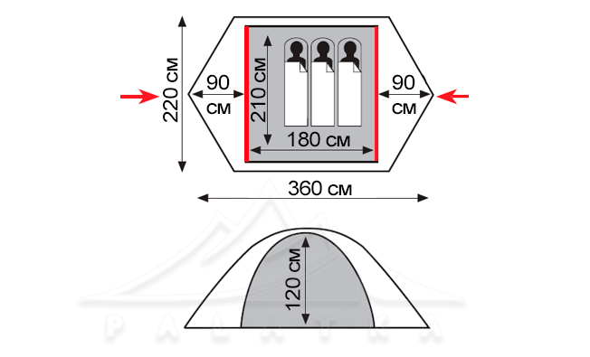 - 2 тамбури для розміщення спорядження та взуття. Додаткова напівдуга трошки збільшує корисний об'єм тамбурів.