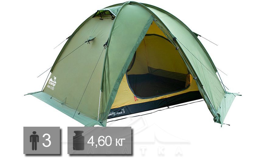 Намет Tramp UTRT-028 Rock 3 v2 — всесезонний 3-місний намет для туристичних походів. Має зовнішній каркас з 3-ма дугами, 2 входи та 2 однакових тамбури. Можна ставити тільки зовнішній тент. Універсальне рішення як для походів, так і для пляжного відпочинку.