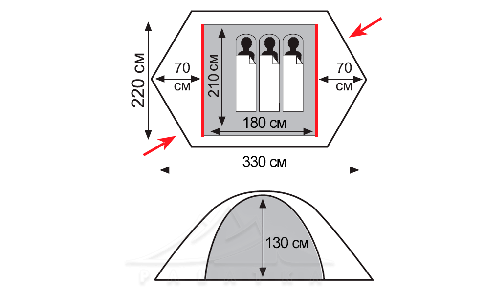 - Зовнішній тент з посиленого поліестеру (Diamond RipStop) з PU-просоченням, водостійкістю 8000 мм H2O
