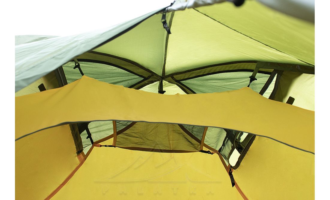 - Сітчасті вентиляційні вставки вгорі на внутрішньому наметі, з блискавками, що дозволяє регулювати вентиляційні віконця зовнішнього намету не виходячи назовні