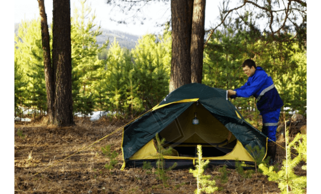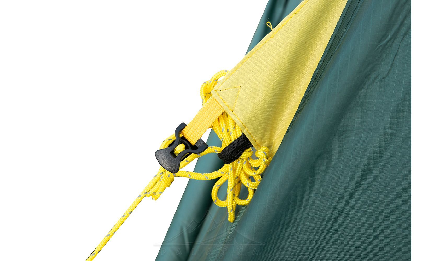 - Штормові відтяжки зі світлоповертаючими елементами для фіксації намету, добре помітні у світлі ліхтаря.