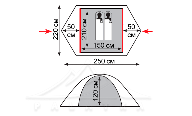 - 2 вентиляційні віконця у зовнішньому тенті зі складними стійками-підпорами