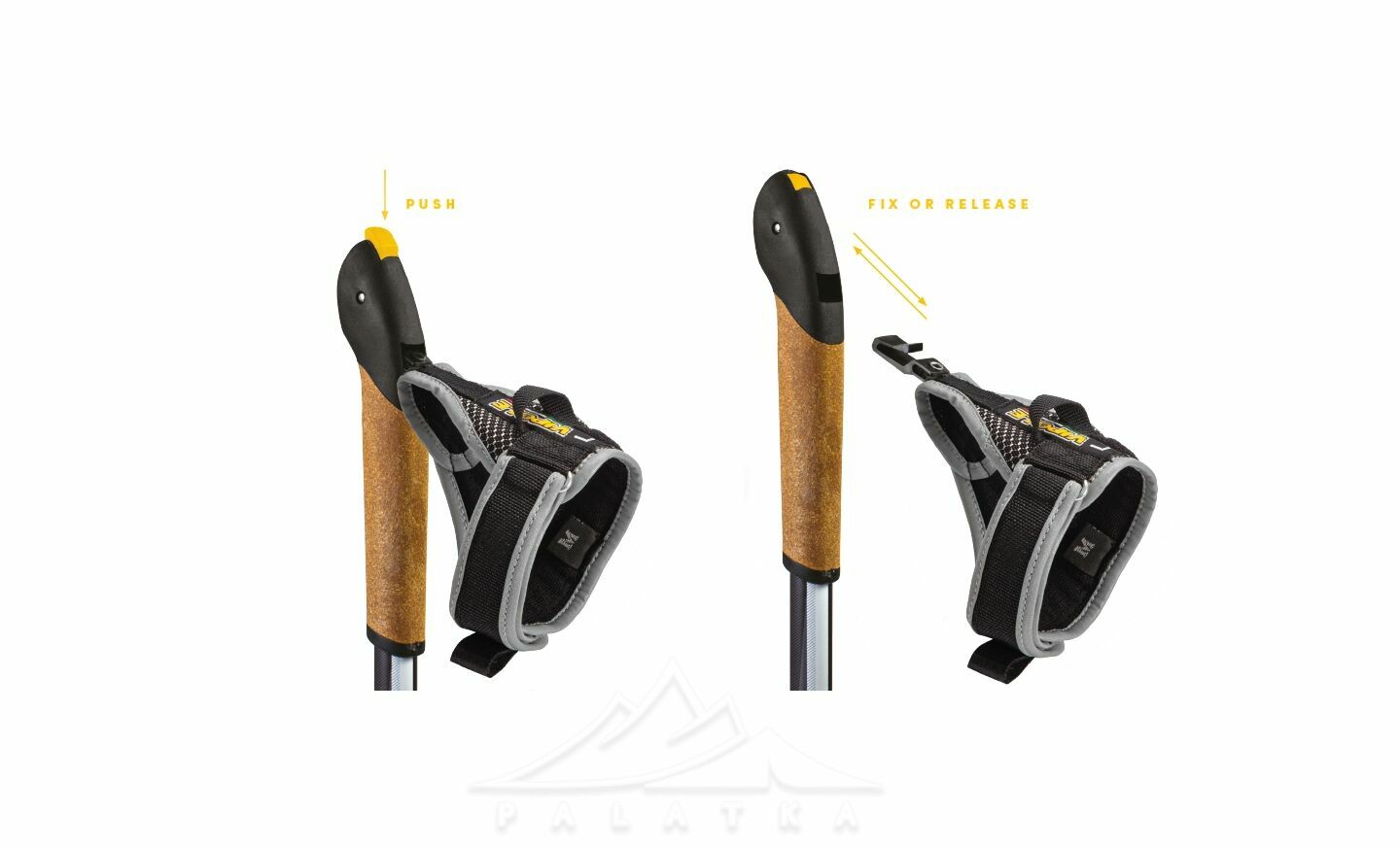 - Асиметричні темляки Asymmetric Nordic Power Strap з регуляцією за розміром кисті, виготовлені з дихаючого, високоміцного, та гіпоалергенного неопрена, зі шкіряними вставками між пальцями.