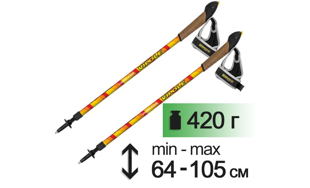 Палиці для скандинавської ходьби Vipole S2038 Vario Kids — легкі та міцні алюмінієві 2-секційні дитячі палиці з регульованою довжиною. Підійдуть для дітей і підлітків зростом від 95 до 150 см.