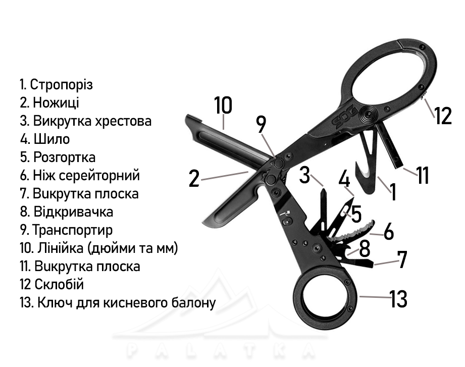 Мультитул SOG ParaShears — це повнорозмірний мультитул, основним інструментом якого є ножиці. Виконуючи 13 функцій, він стане вашим надійним помічником у поході, на риболовлі та у побуті.
