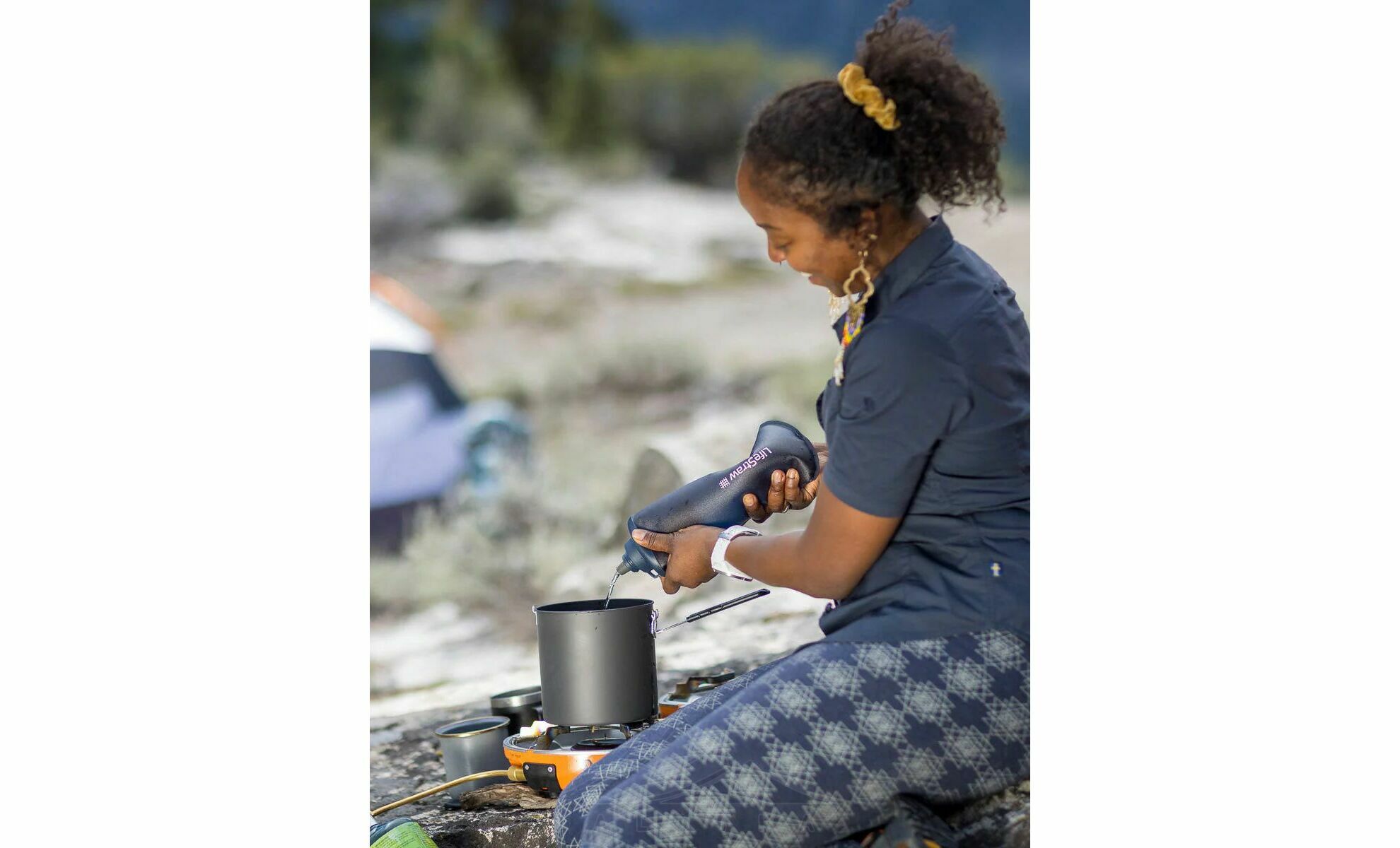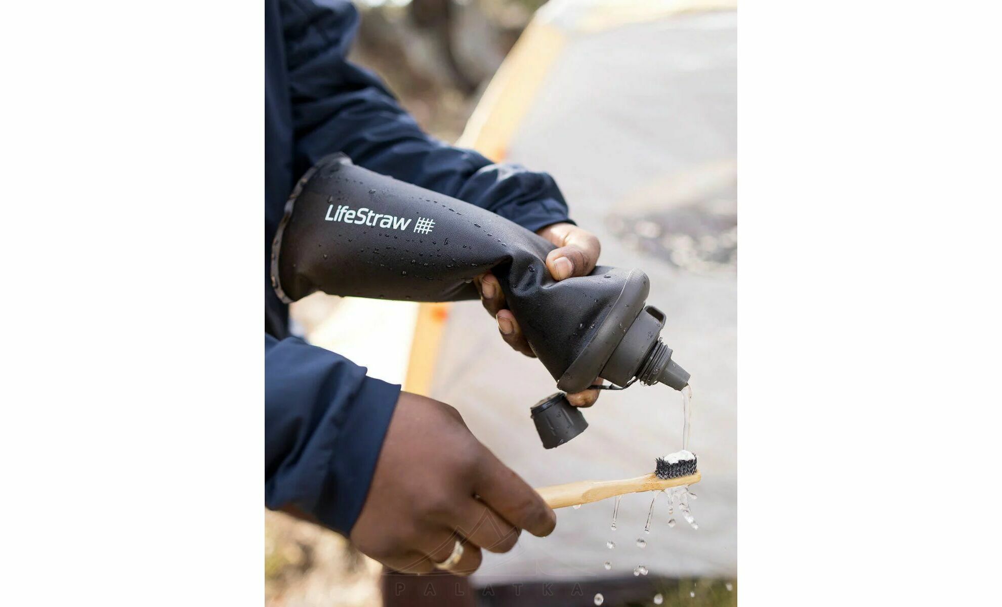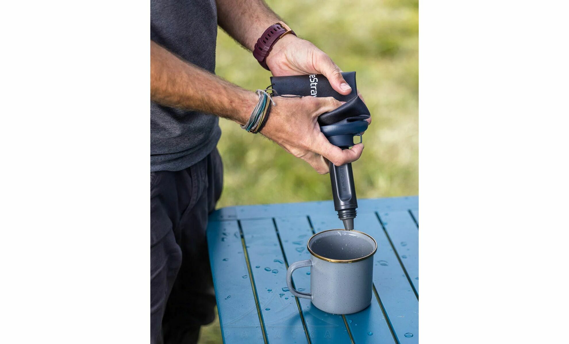 - Неочищена вода заливається в пляшку, під час пиття вода проходить через пори мікрофільтру і вже очищенною потрапляє одразу вам до рота. А за рахунок м'яких стінок ви можете видавити воду з пляшки у іншу ємність, щоб використовувати її для приготування їжі.