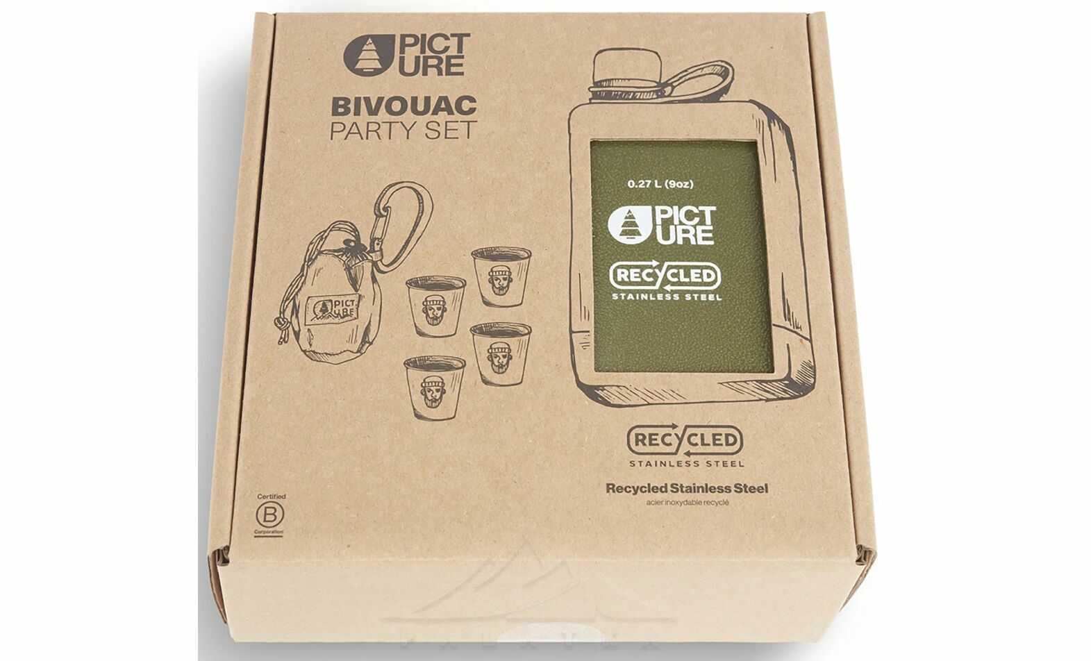 Picture Organic Bivouac Party Set — універсальний набір із міцної сталевої фляги та чарок, який стане чудовим подарунком для любителів пригод. Ідеально підходить для відпочинку на природі, гірських мандрівок, привалів чи затишних вечорів біля вогнища.