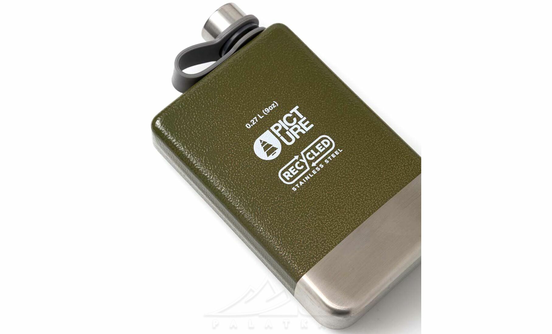 - Фляга з переробленої нержавної сталі — міцна, стійка до екстремальних умов, зберігає смак напою без сторонніх запахів.
