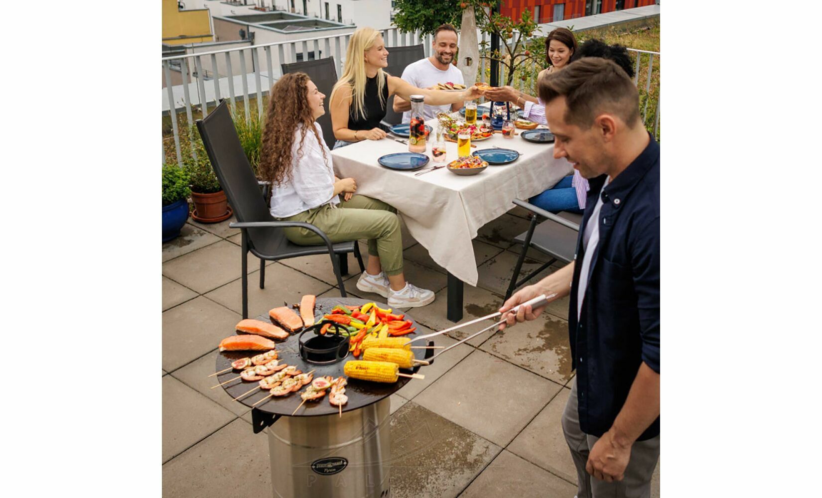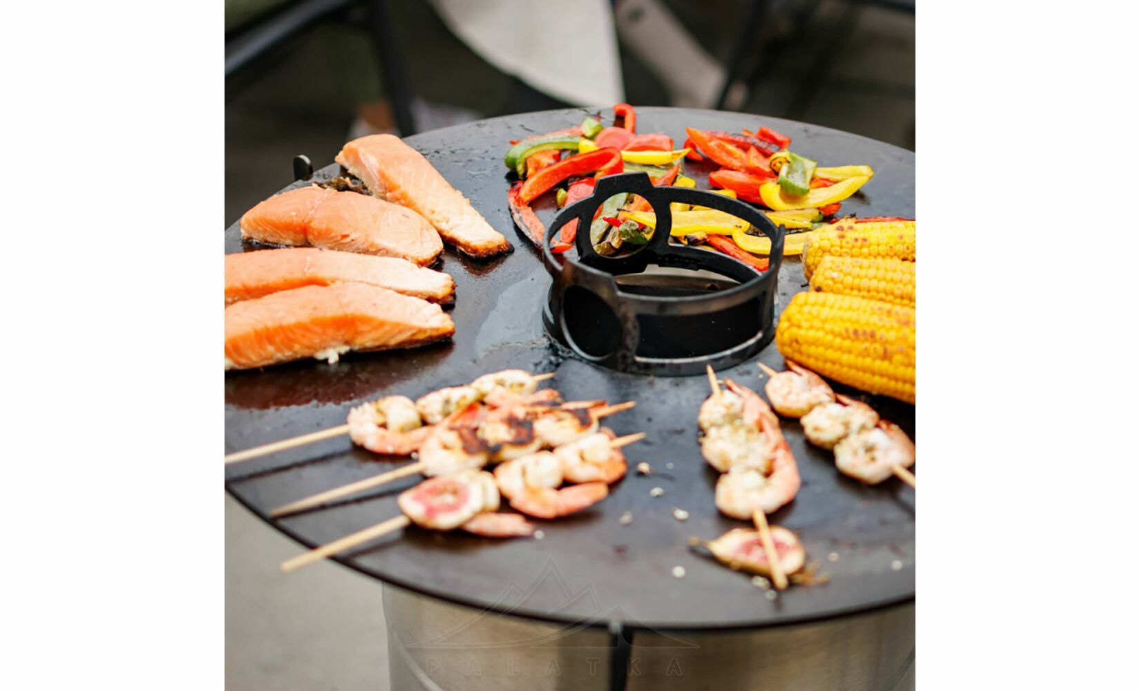 - Комплектується перегородкою, яка встановлюється у центральний отвір, запобігає падінню їжі у вогонь і дозволяє готувати соуси, напої або підігрівати посуд.