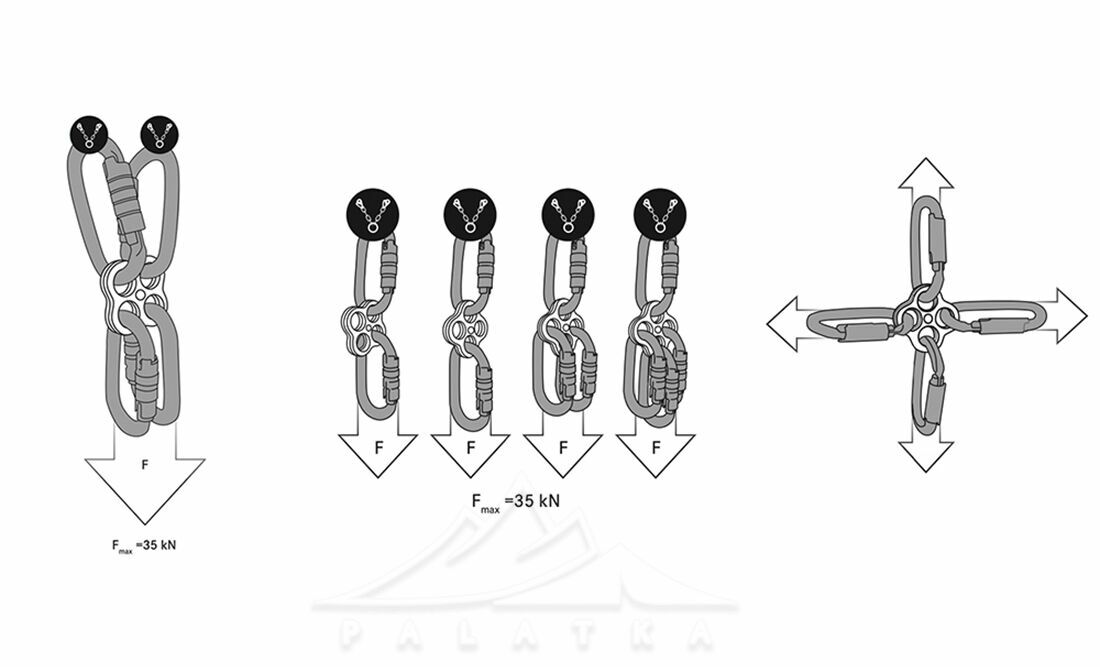 - Отвори діаметром 20 мм сумісні з більшістю карабінів і дозволяють пропускати мотузки чи стропи без додаткових елементів.