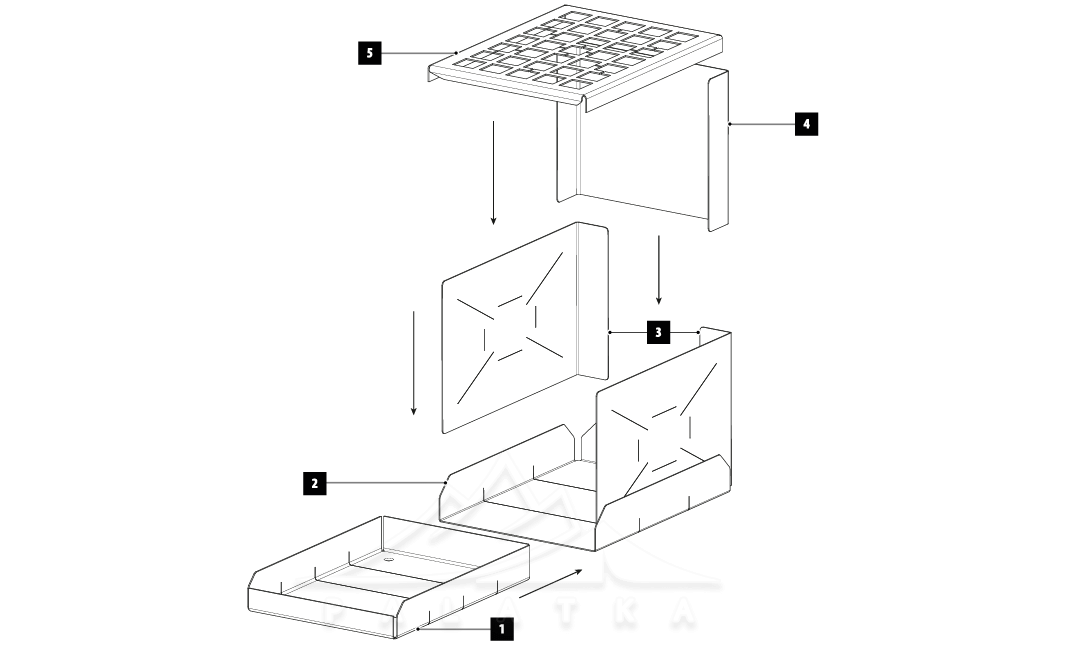 - Конструкція пічки складається з таких елементів: піддон для вогню, нижній піддон, бічні панелі, задня панель, решітка-гриль.
