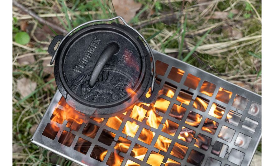 - Піддон для вогню можна підняти на два рівні за допомогою підставок Petromax Oven Brackets for Pocket Stove, які дозволяють ставити під піддон форму для випічки (можна придбати окремо).