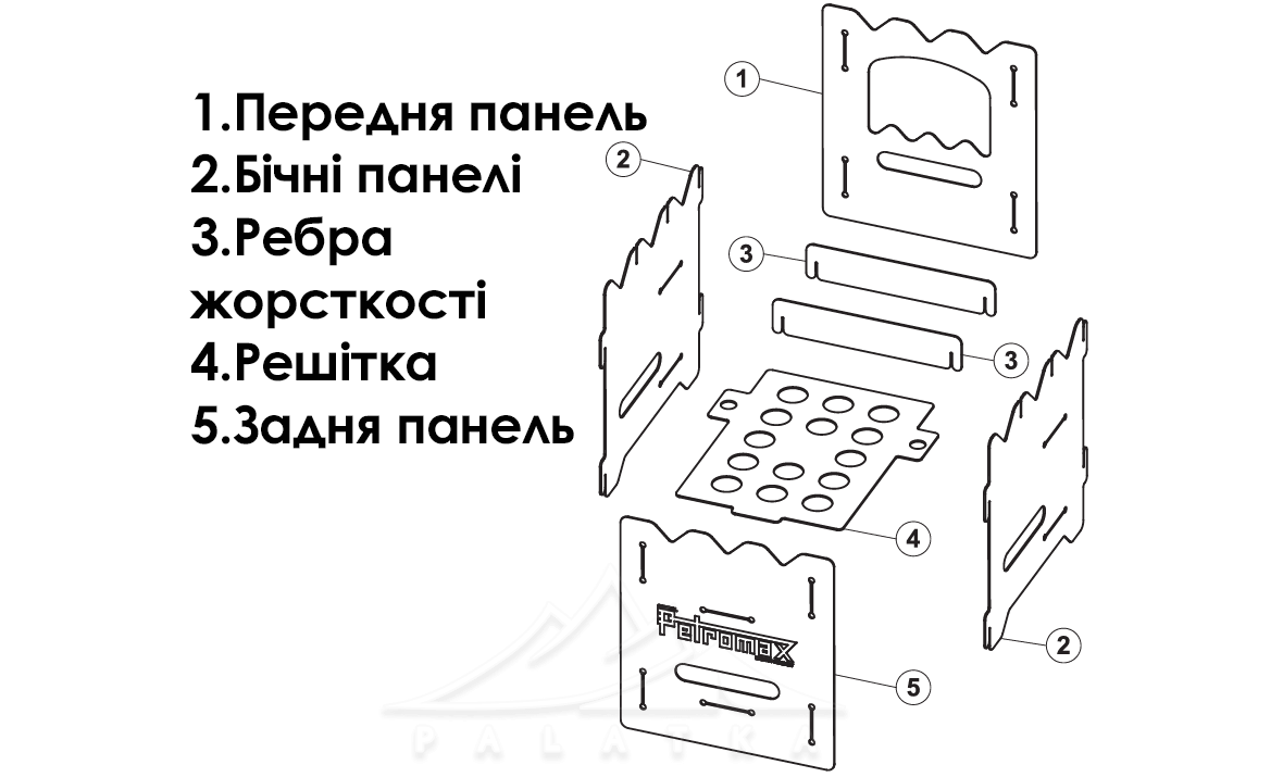 - Конструкція пічки складається з таких елементів: передня панель, бічні панелі, ребра жорсткості, решітка, задня панель.