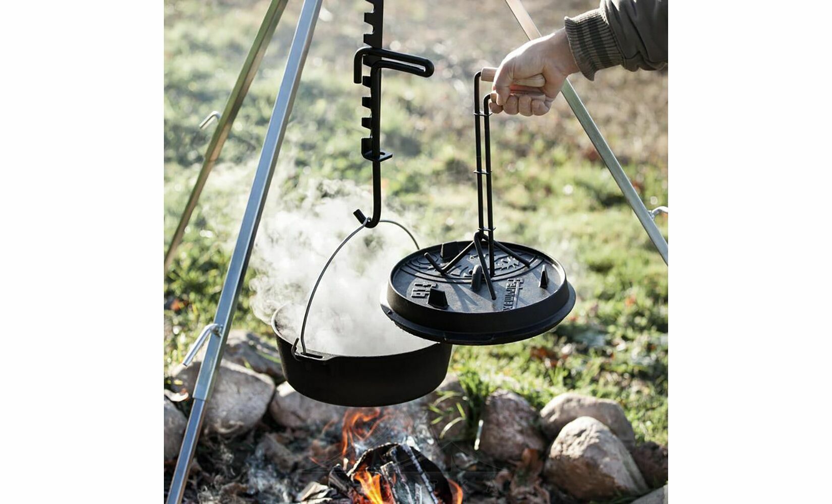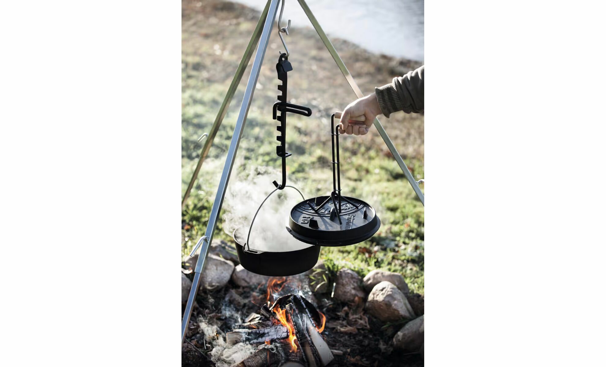 - Знімати посуд, підвішений на тринозі Cooking Tripod, стійці Fire Anchor, перекладині Fire Bridge.