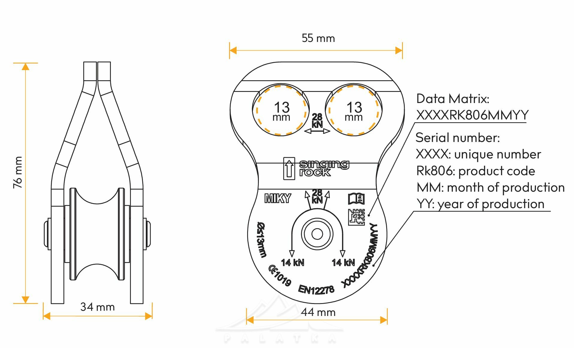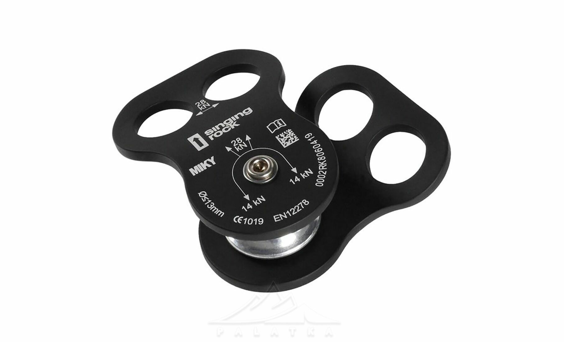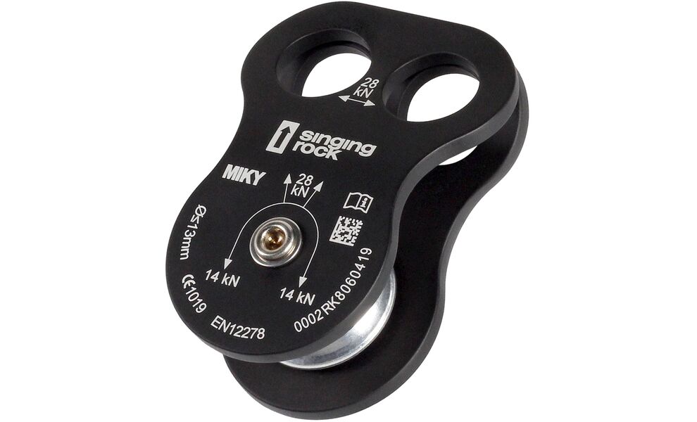 Singing Rock Pulley Miky — компактний і міцний блок із двома кріпильними отворами на поворотних щічках. Призначений для робіт на висоті, арбористики та лазіння по деревах. Сумісний із вузлом типу Prusik.