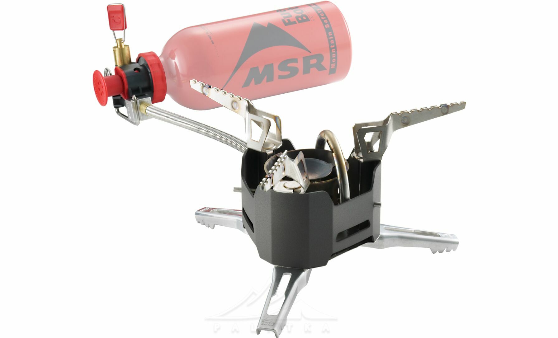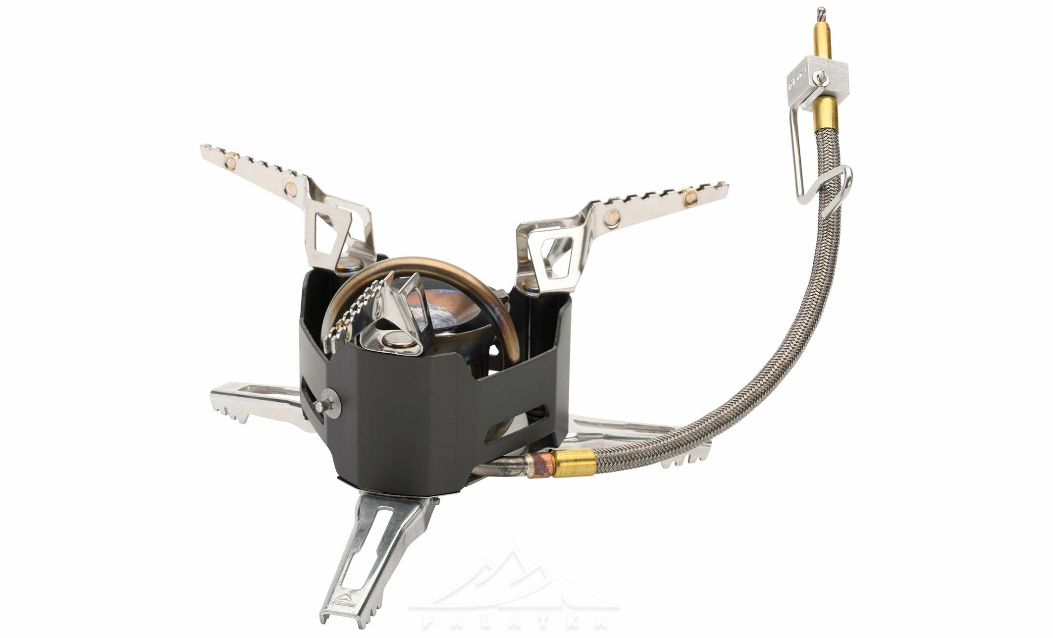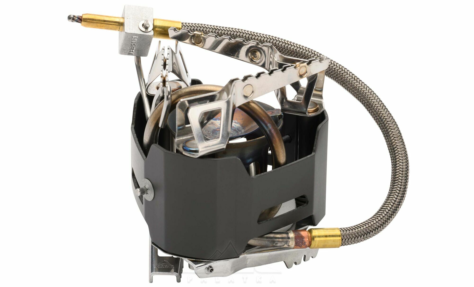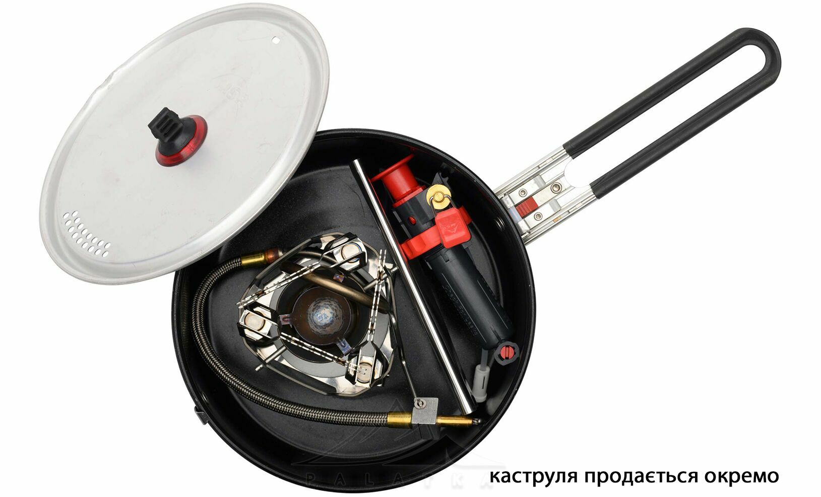 - Гнучкий паливний шланг дозволяє пальнику компактніше складатися та вміститися в 1,5-літрову каструлю MSR (не комплектується).