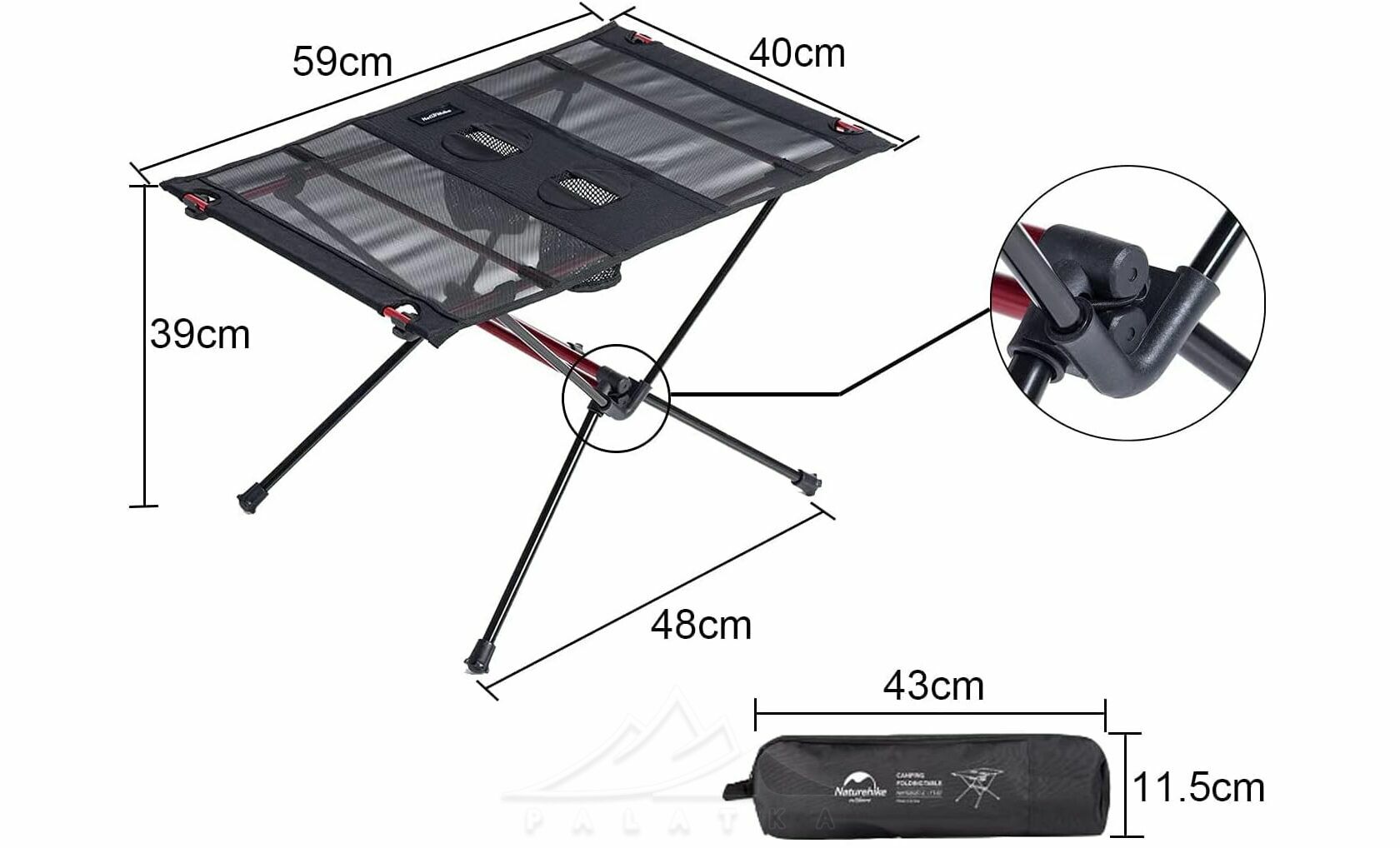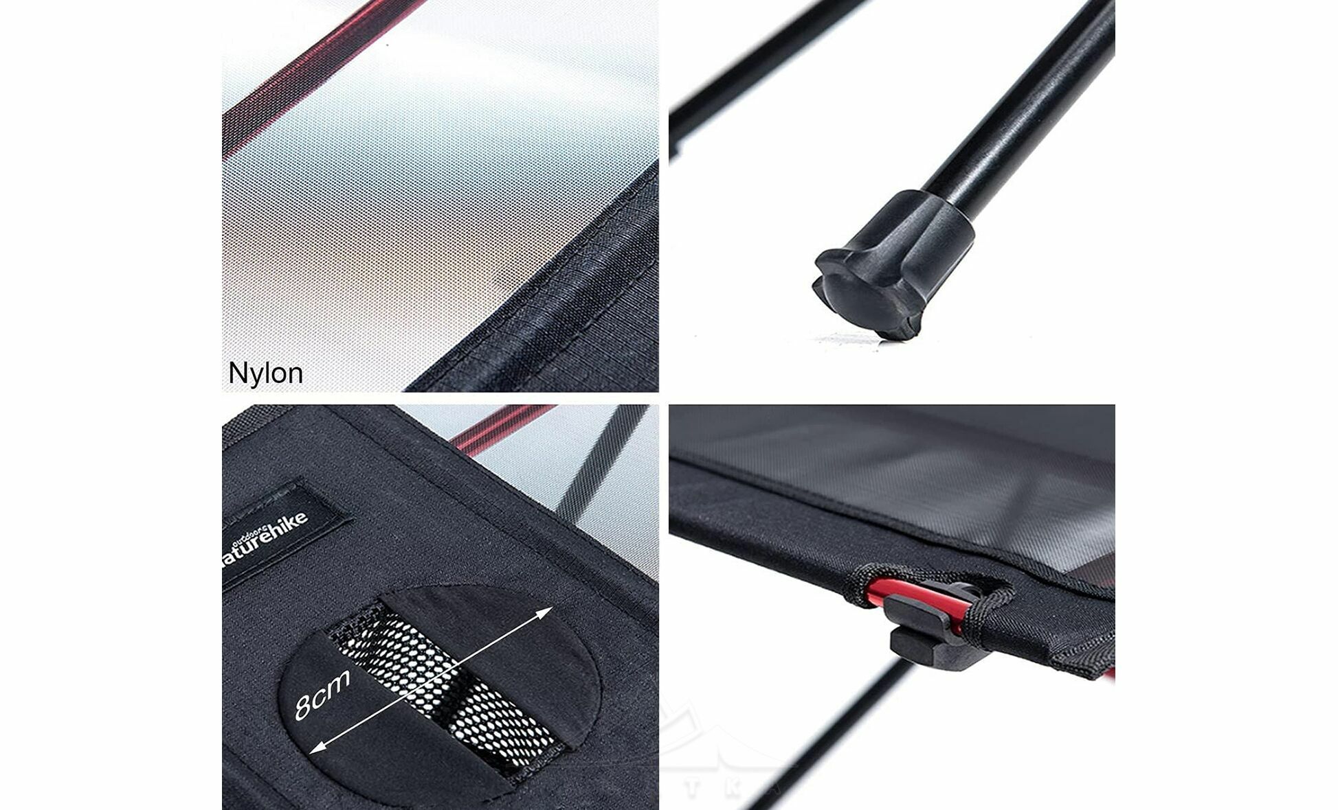 - Сітчаста нейлонова стільниця: міцна й зносостійка, витримує повсякденне навантаження та дозволяє зручно розміщувати посуд, напої чи інші речі.