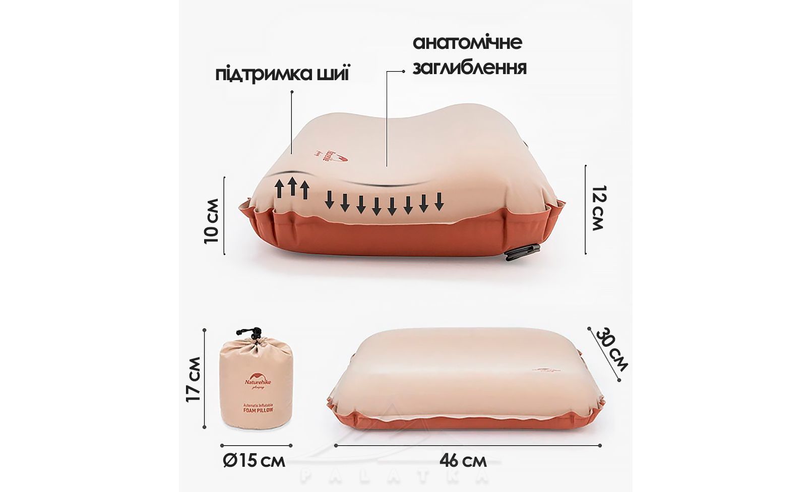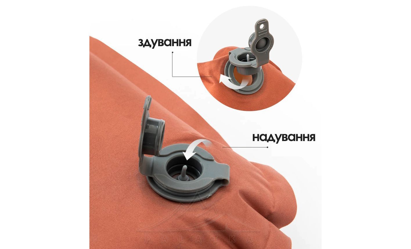 - Має двосторонній клапан, з його допомогою можна зручно надувати та здувати подушку, а також регулювати її пружність та зручну для вас висоту.