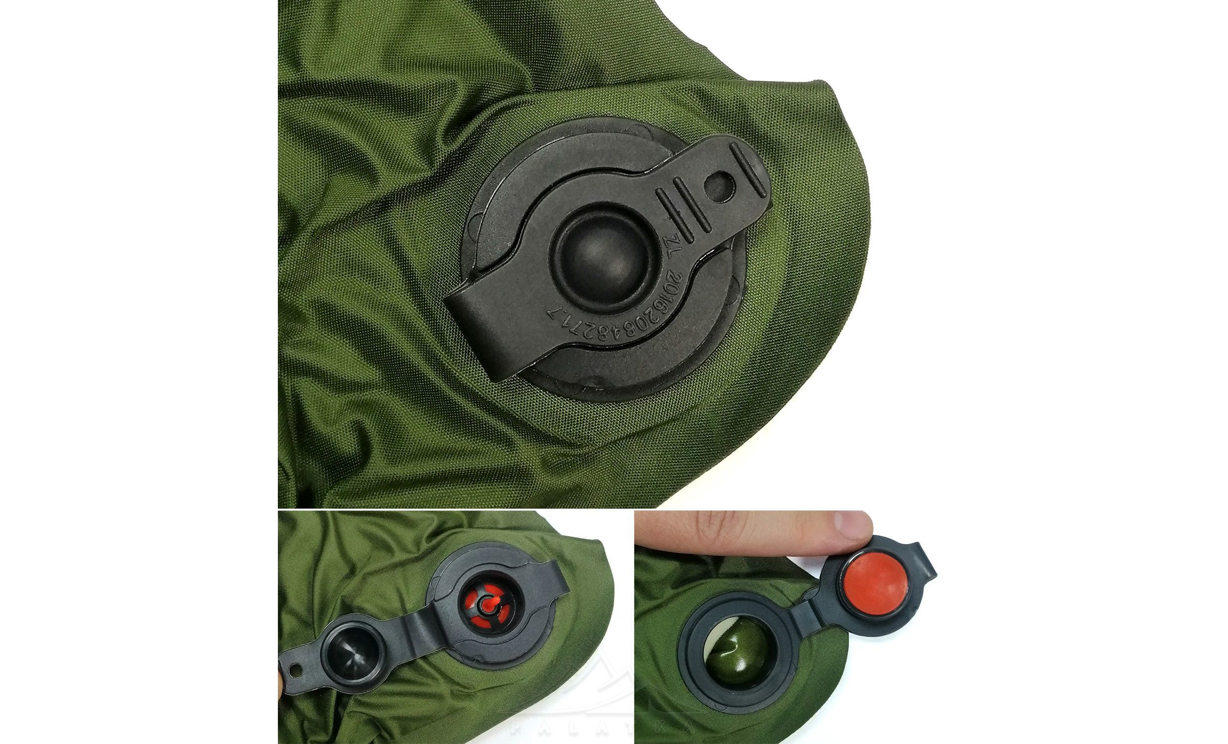 - Оснащений подвійним клапаном, який полегшує надування та здування килимка. Для надування килимка потрібно відкрити верхню частину клапану, при цьому повітря не буде виходити з килимка, для здування потрібно відкрити обидві частини клапану і повітря почне миттєво виходити.