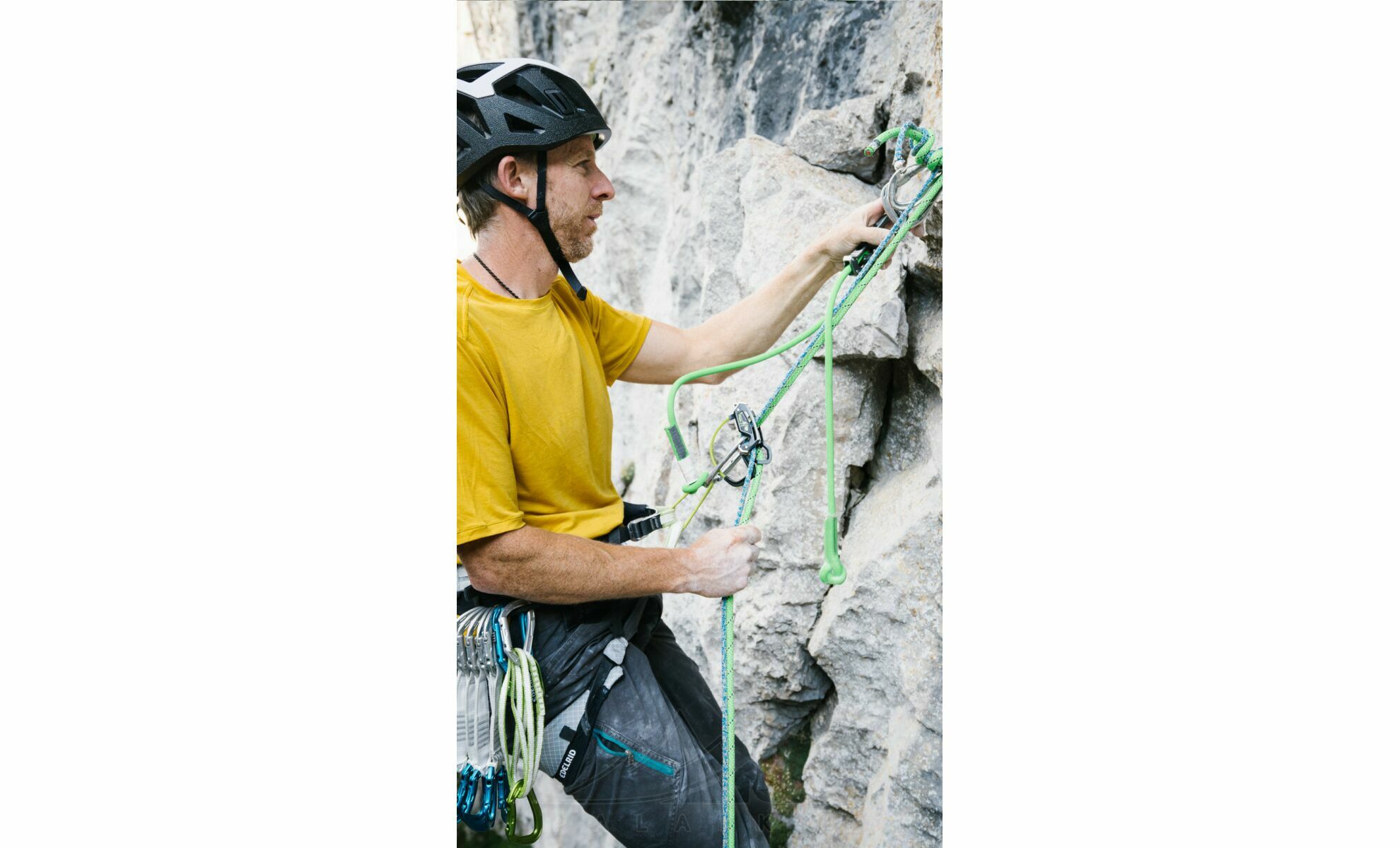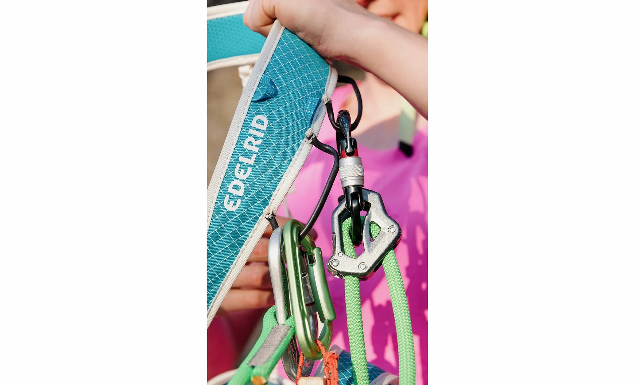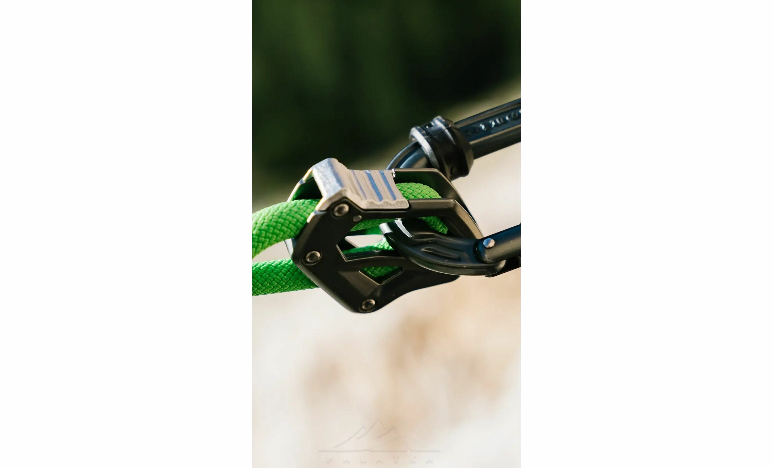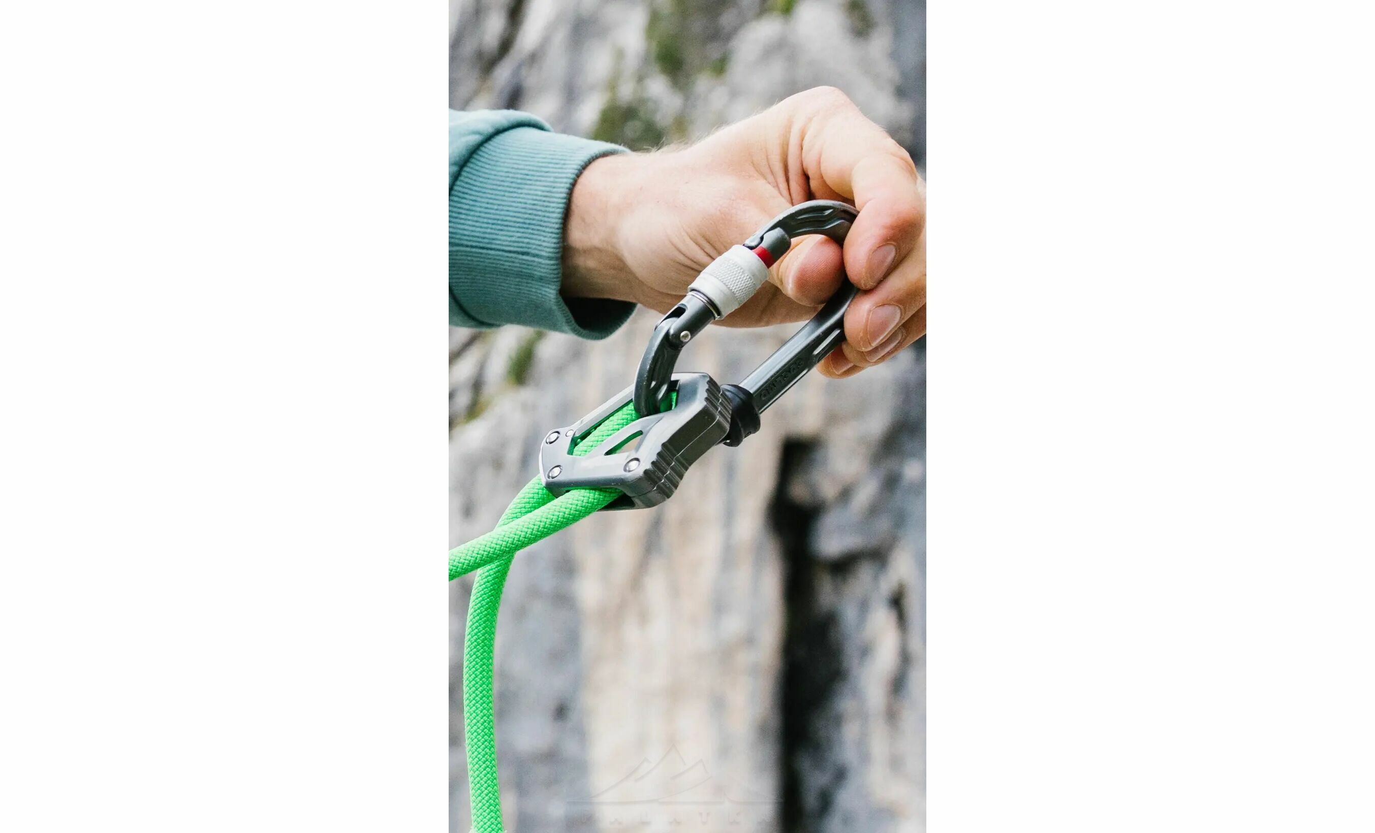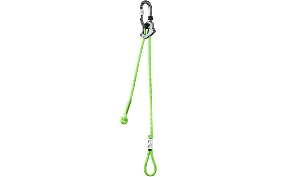 - Велика з’єднувальна петля дозволяє вв’язати самостраховку в систему напівсхоплювальним вузлом, економлячи карабін і зменшуючи кількість ланок у страховці.