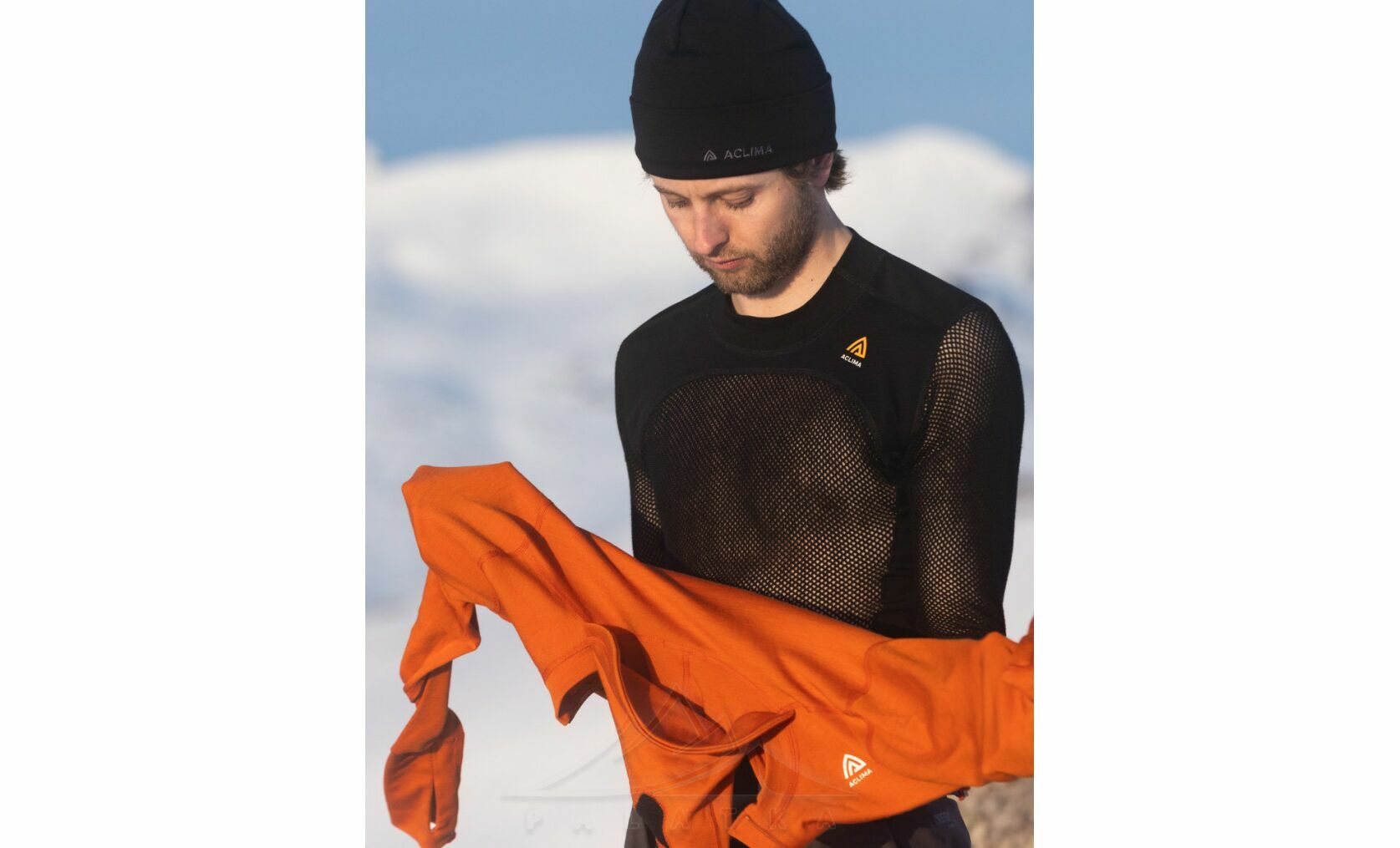 - Підкладка з функціональної вовняної сітки Aclima WoolNet (80% вовна мериноса, 20% нейлон) зменшує площу контакту зі шкірою, прискорює відведення вологи під час руху й допомагає зберігати тепло під час зупинок.