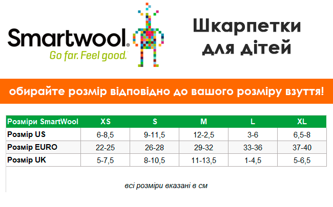 таблиця розмірів дитячих шкарпеток SmartWool