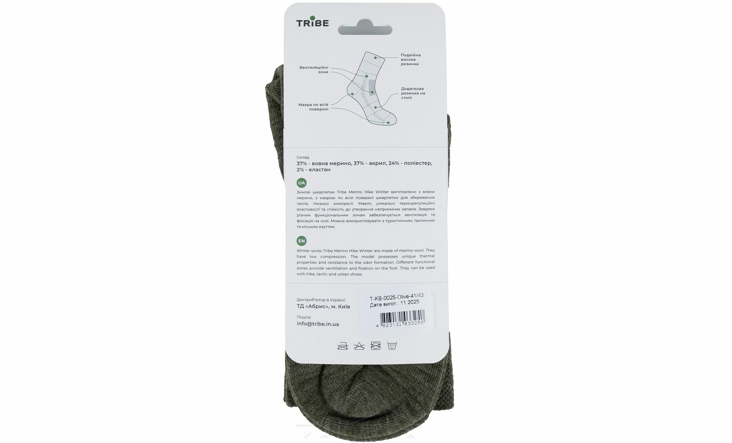 Tribe Merino Hike Winter — теплі трекінгові унісекс-шкарпетки з вовни та синтетики. Вони надійно зберігають тепло, ефективно відводять вологу й залишаються м’якими та комфортними навіть під час тривалого носіння. Ідеальний вибір для зимових походів, подорожей або для щоденного використання в місті.